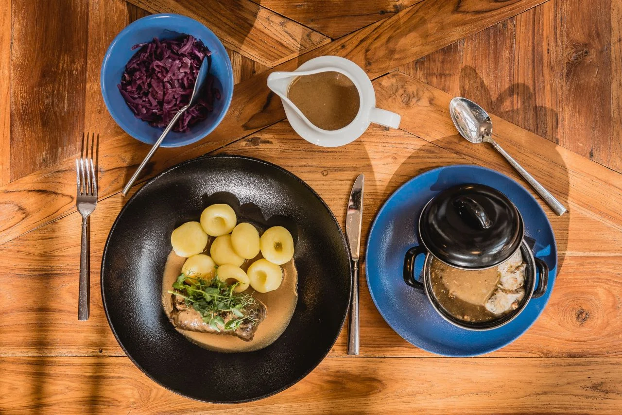 - danie główne: restauracja U Kelnerów za gicz cielęcą z puree ziemniaczanym i konfiturą cebulową oraz kapustą zasmażaną,