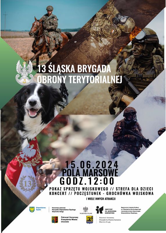 15 czerwca br. odbędą się uroczyste obchody kolejnej rocznicy utworzenia 13 Śląskiej Brygady Obrony Terytorialnej oraz Narodowego Dnia Powstań Śląskich pod Patronatem Marszałka Katowic, Wojewody Śląskiego, Prezydenta Miasta Katowice, Prezydenta Miasta Chorzów oraz współpracy Regionalnego Instytutu Kultury im. Wojciecha Korfantego.