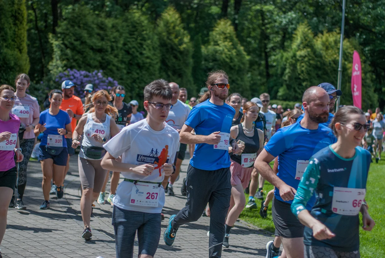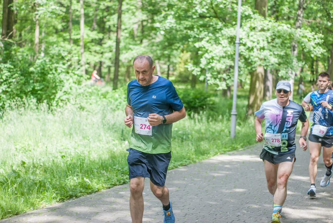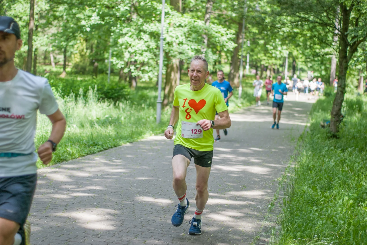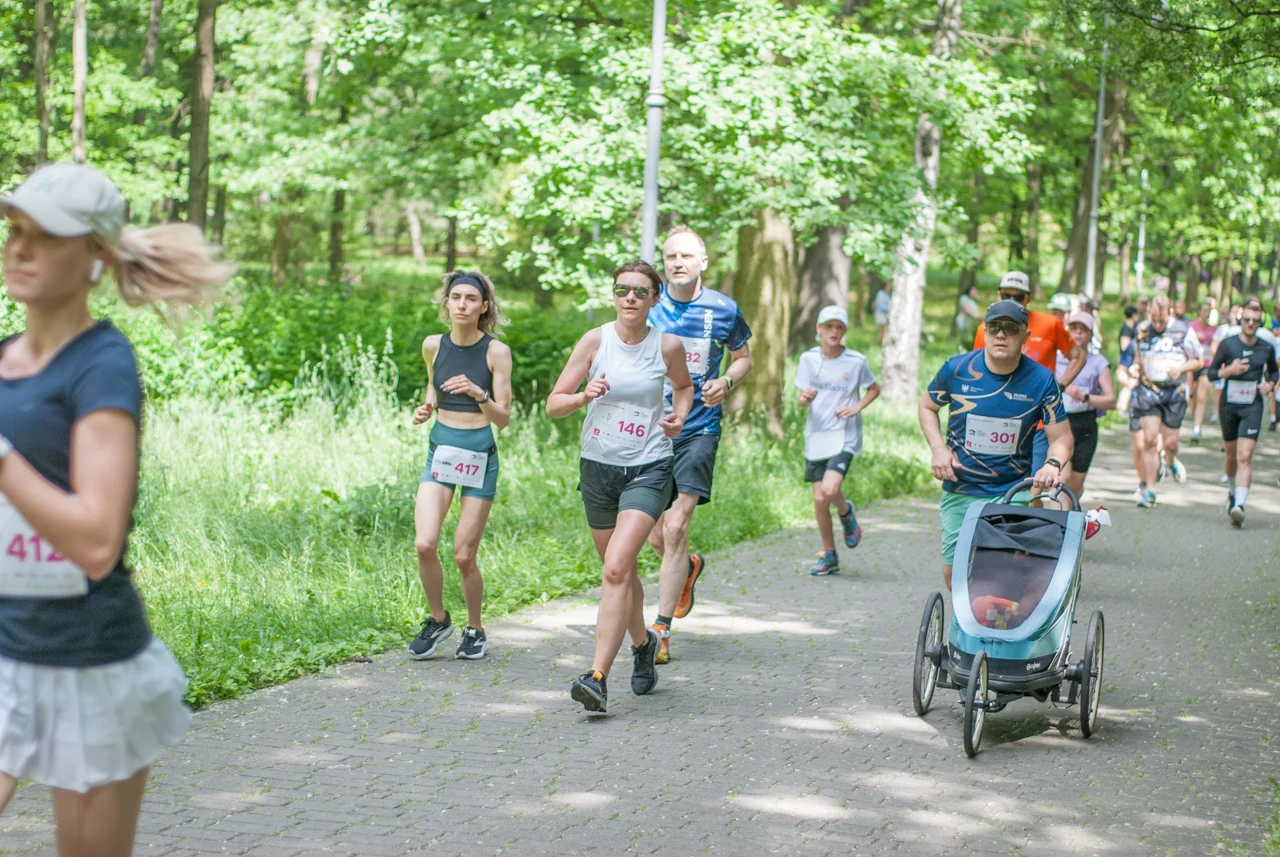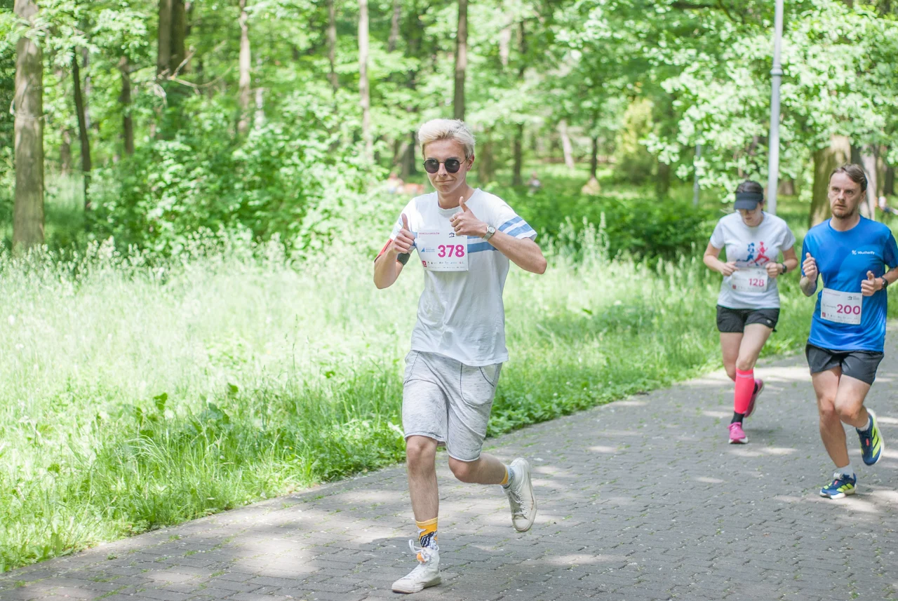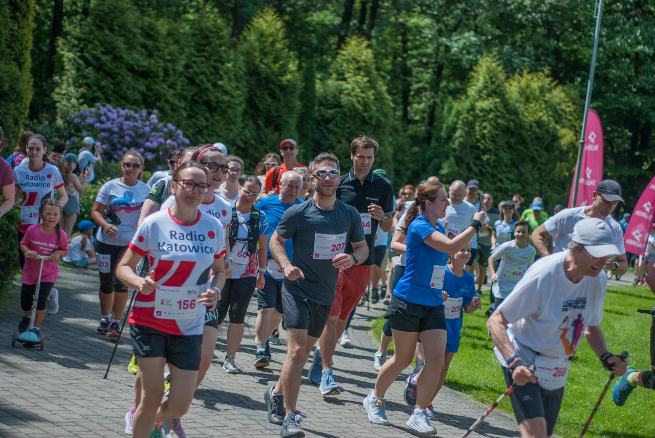O 11:30 wystartowali zawodnicy biorący udział w biegu głównym na dystansie 5 km. Czekały na nich dwie pętle liczące 2,5 km, prowadzące po trasie którą standardowo, co sobotę, truchtają uczestnicy parkrun Katowice. Tu uczestników było już kilkuset.