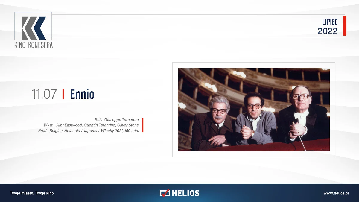 11 lipca to ważna data na repertuarowej mapie kin Helios bowiem tego dnia Giuseppe Tornatore – wieloletni przyjaciel Ennio Morricone – zabierze widzów w piękną, osobistą podróż szlakiem życia i dokonań muzycznych dla świata filmu. Film „Ennio” to blisko trzygodzinna wyprawa, która poruszy serca niejednego widza, a prawdziwych fanów kina i muzyki zabierze na jeszcze jedno spotkanie z Mistrzem! Przed projekcją filmu zostanie wyświetlony specjalny materiał przygotowany przez dziennikarkę radia RMF Classic – Magdalenę Juszczyk. Będzie dotyczył muzyki i kariery Ennio Morricone, a widzowie zobaczą w nim studio RMF Classic i warszawskie kino Helios w Blue City.