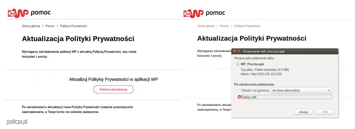 Kampanie phishingowe mogą się rozprzestrzeniać również za pomocą wiadomości e-mail. Przykładem tego są fałszywe maile, które obserwujemy od prawie roku. Nadawcy podszywają się pod operatorów polskich serwisów pocztowych – Onet, Interia, O2 i Wirtualna Polska. Zależnie od wariantu oszustwa, w treści wiadomości pojawia się informacja o konieczności zatwierdzenia nowej polityki prywatności lub powiadomienie o tym, że konto zostało zablokowane z powodu naruszenia regulaminu przez użytkownika. W obu przypadkach ofiara jest namawiana do przejścia na wskazaną stronę w celu zdjęcia blokady konta. Jeśli otworzymy stronę w przeglądarce internetowej na komputerze, nasze urządzenie może zostać zainfekowane wirusem wykradającym poufne dane. Wejście na stronę przy użyciu telefonu z systemem Android wyświetla inną zawartość. Użytkownicy telefonów są nakłaniani do pobrania aplikacji, która ma rzekomo być wymagana do dokończenia procesu weryfikacji. Aplikacja ta w rzeczywistości jest szkodliwym oprogramowaniem wykradającym dane bankowe.