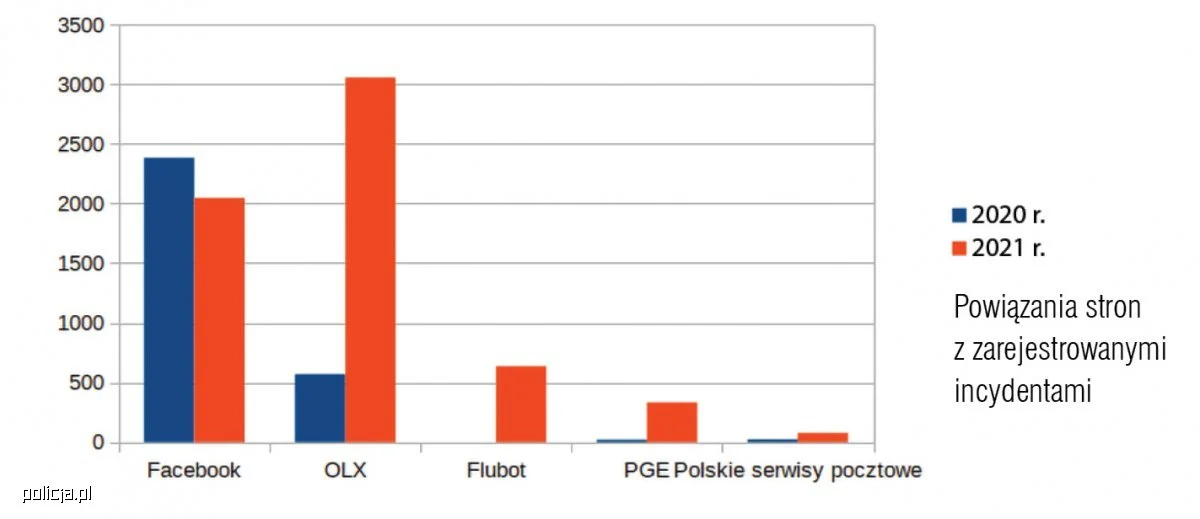 W 2020 r. aż 58 proc. domen znajdujących się na liście ostrzeżeń CERT Polska było powiązanych z fałszywymi panelami logowania do portalu Facebook. W tym roku CERT obserwuje ciągły wzrost szkodliwych domen wykorzystujących wizerunek platformy OLX – w 2020 r. zarejestrował 570 takich incydentów. Dla porównania – rok wcześniej było ich jedynie pięć.
