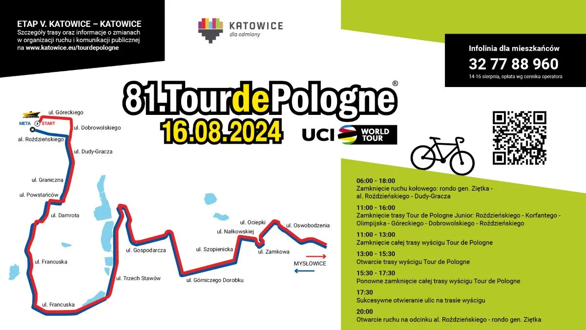 - Od godz. 6.00 w związku z budową infrastruktury mety i 1 km finiszu jest planowane zamknięcie alei Roździeńskiego od ronda gen. Ziętka do ul. Dudy-Gracza (w obu kierunkach) oraz ul. Dudy-Gracza (zachodnia nitka) od skrzyżowania z al. Roździeńskiego do ul. Maślińskiego.