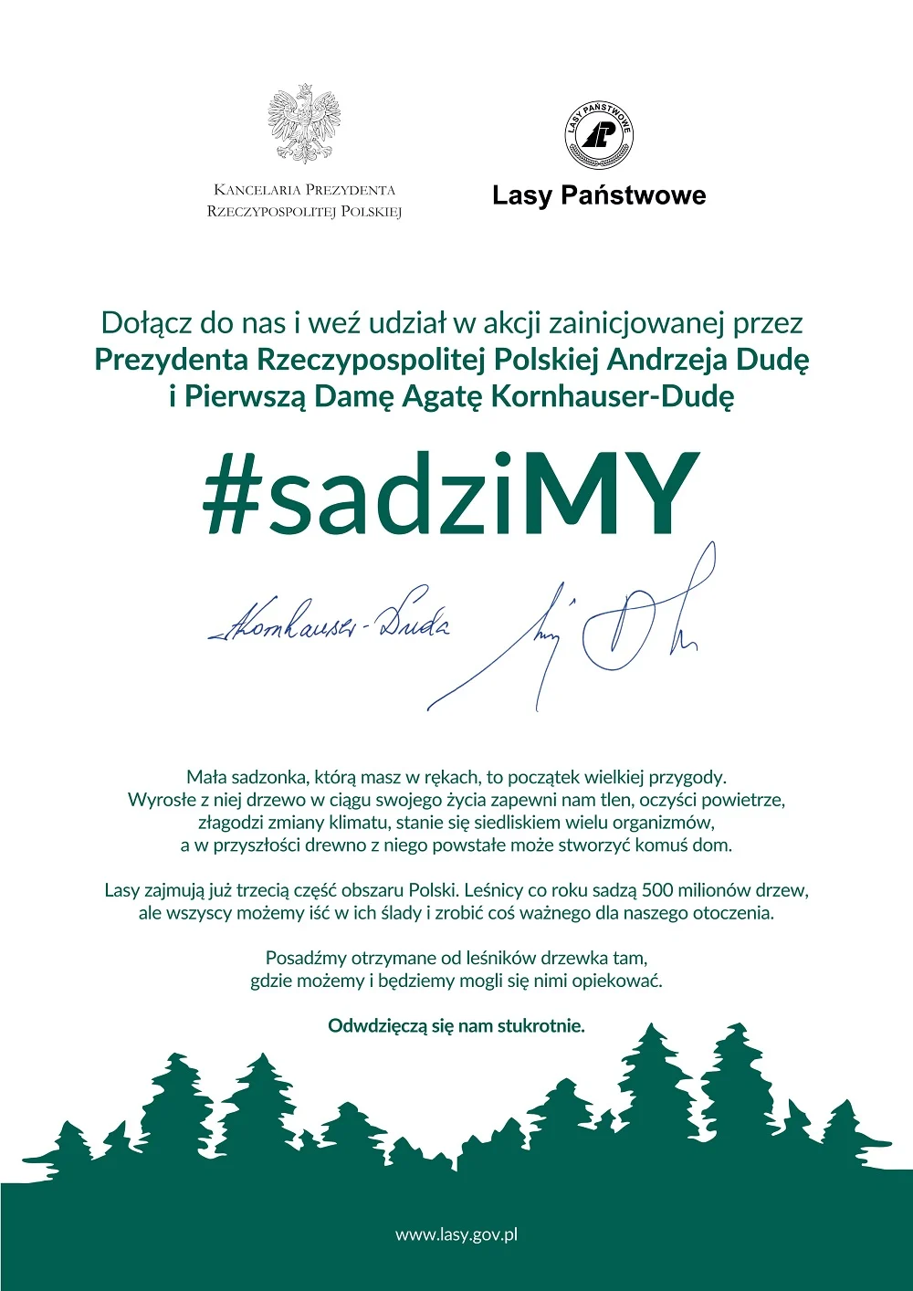 Lasy i drzewa zapewniają nam tlen, oczyszczają powietrze, wpływają korzystnie na klimat i na samopoczucie nas wszystkich. Są domem dla wielu gatunków roślin, grzybów i zwierząt. Dostarczają najbardziej ekologiczny surowiec, drewno, tworzący domy również dla nas. Polscy leśnicy każdego roku sadzą 500 milionów drzew. Mimo że czasem wysiłek wielu pokoleń niszczą klęski żywiołowe, sadzenie trwa i lasów w Polsce stale przybywa. Zajmują one już blisko jedną trzecią powierzchni naszego kraju. Drzewa są jednak potrzebne wszędzie tam, gdzie żyjemy, nie tylko w lesie. Dzięki inicjatywie Prezydenta Rzeczypospolitej Polskiej i Pierwszej Damy teraz wszyscy mogą z łatwością posadzić własne drzewo. Przyłącz się do ogólnopolskiej akcji #sadziMY i posadź własne drzewko!