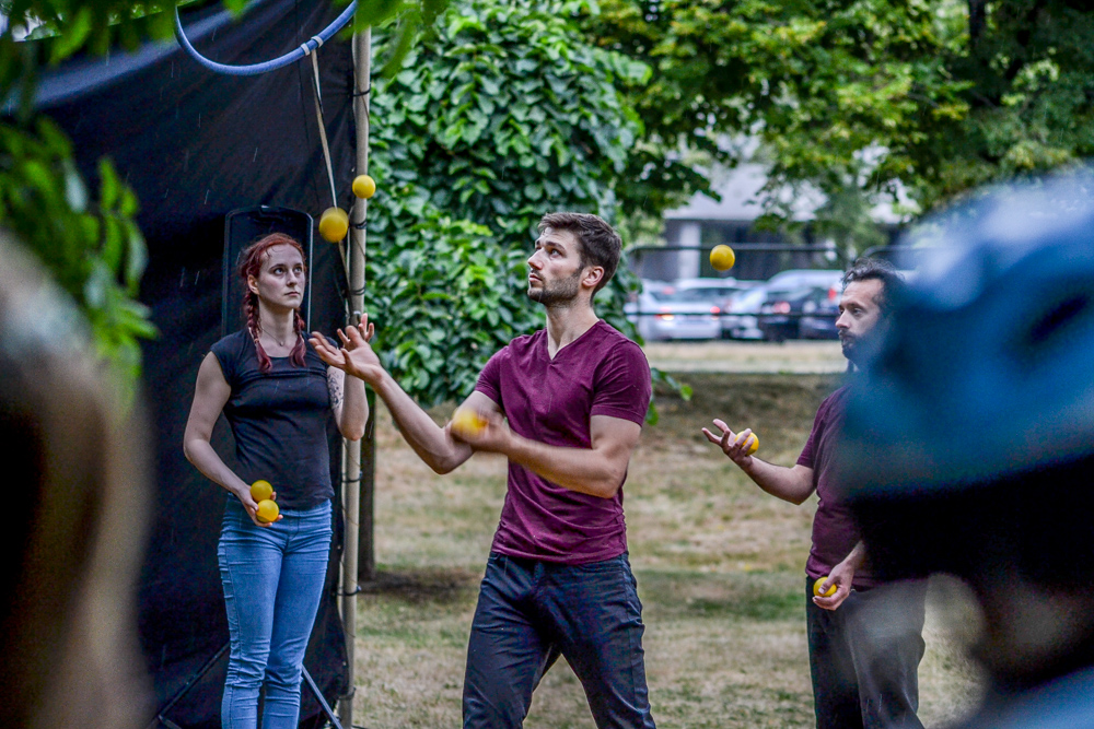 Cie Pol&Freddy [BE] – CIRQUE DEMOCRATIQUE DE LA BELGIQUEPokaz w wykonaniu trupy Pol & Freddy tj. Sander’a De Cuyper’a i Brama Dobbelaere’a z gościnnym udziałem Gaba Bondeweli’a z trupy ShakeThat. Artyści znają się od 20 lat, a swój cyrk demokratyczny założyli w 2006 roku. W swoim demokratycznym cyrku łączą żonglerkę, akrobację i absurdalny humor.
