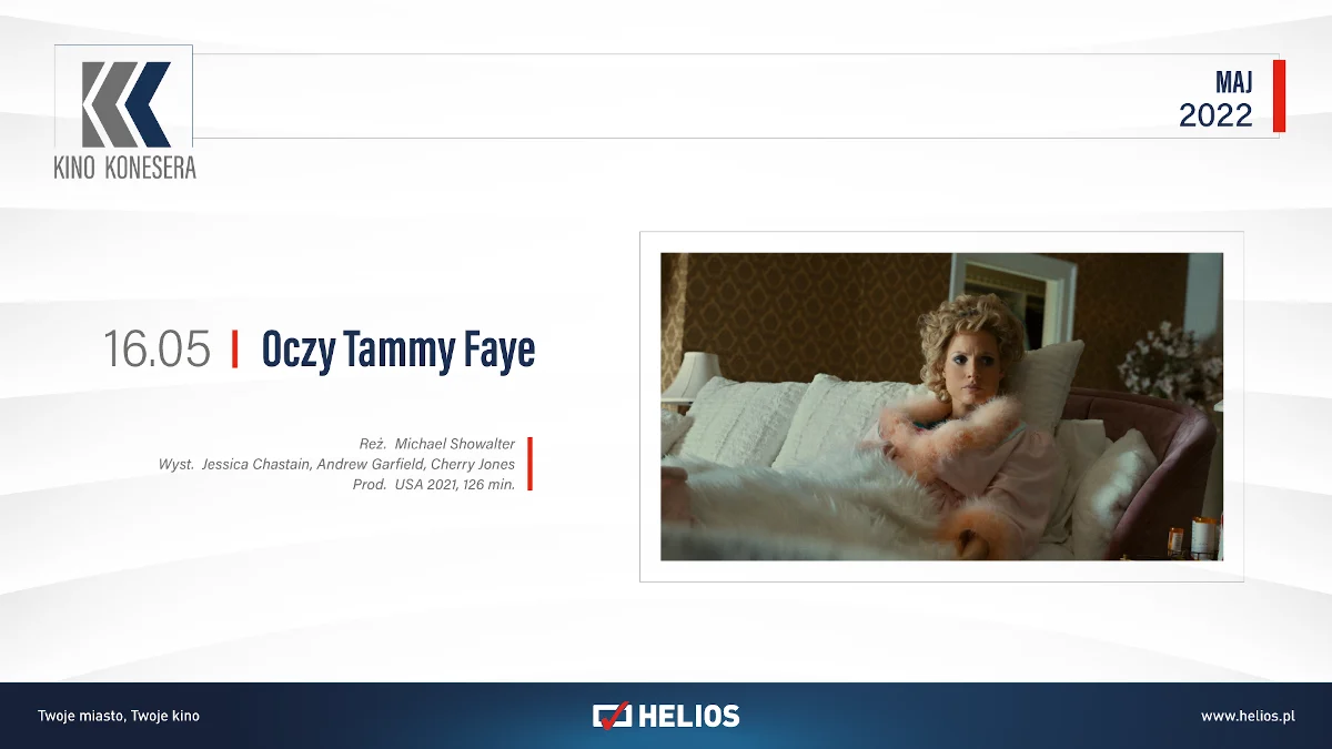 Kolejna data w kalendarzu wydarzeń specjalnych to 16 maja, godzina 18:00 i hasło Kino Konesera. A w nim „Oczy Tammy Faye” – dramat przybliżający niezwykłą historię sukcesów i niepowodzeń telewizyjnej ewangelistki. Do legendy przeszła nie tylko jej otwartość i życzliwość wobec ludzi z różnych środowisk, ale też jej wyjątkowy głos i charakterystyczny makijaż.