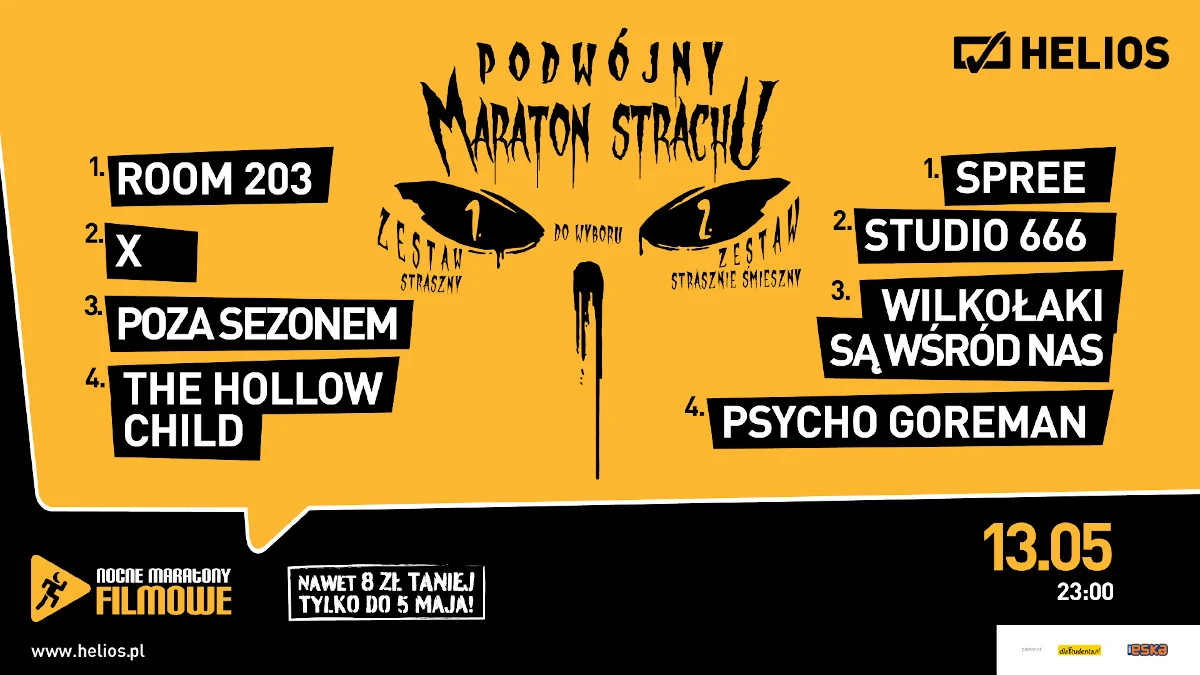 Helios bez projektów specjalnych? Wykluczone! Pierwsza data do zapisania w kalendarzu specjalnych wydarzeń to 13 maja, godzina 23:00, a przy niej adnotacja „Podwójny Maraton Strachu”. Dwa zestawy filmów, dwie drogi do obrania – jedna pełna strachu, druga ze strachem okraszonym żartem. W zestawie pierwszym czekają „ROOM 203”, „X”, „POZA SEZONEM” i „THE HOLLOW CHILD”. Propozycja numer 2 to natomiast „SPREE”, „STUDIO 666”, „WILKOŁAKI SĄ WŚRÓD NAS” oraz „PSYCHO GOREMAN”.