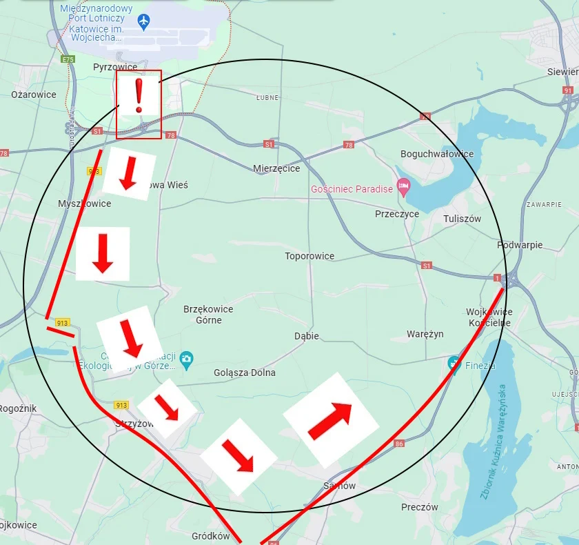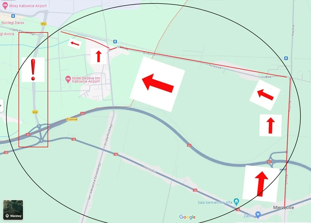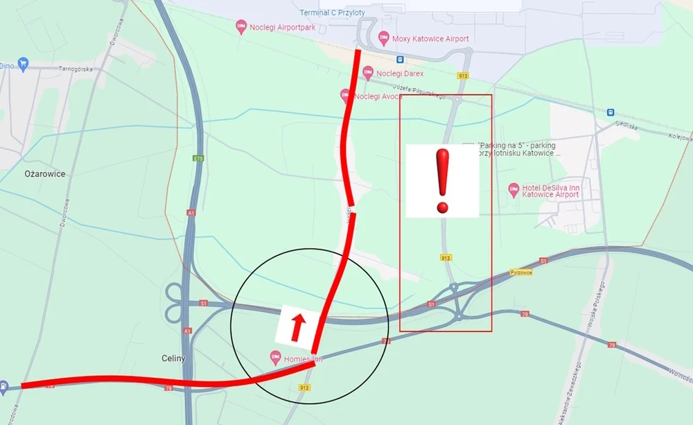 Od strony Siewierza, aby ominąć powstałe utrudnienia, należy kierować się w Mierzęcicach w stronę trasy S1/A1, a w przypadku dojazdu do lotniska, należy skręcić w ulicę Gminną/Wspólną, a następnie Kolejową i dalej przez ulicę Siedliska w kierunku portu.