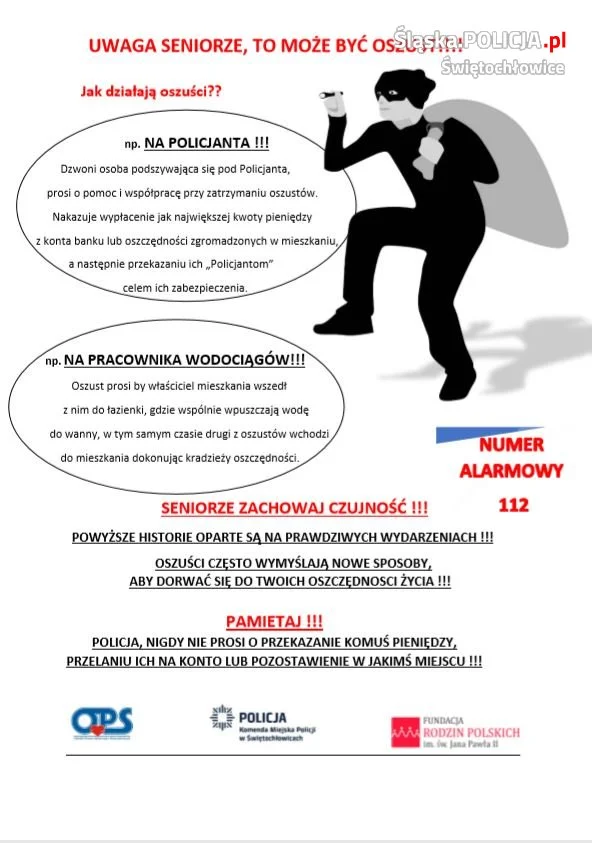 Stróże prawa z Komendy Miejskiej Policji w Świętochłowicach systematycznie pracują i angażują się w działania na rzecz poprawy bezpieczeństwa seniorów zamieszkujących miasto. Pomimo panującej pandemii koronawirusa, która wymusiła ograniczenie bezpośrednich spotkań, mundurowi korzystają z różnych dostępnych form, których celem jest dotarcie do społeczności senioralnej zamieszkującej miasto. Ostatnio w parafiach na terenie miasta, a także w wielu świętochłowickich budynkach na klatkach schodowych zawisły plakaty przestrzegające przed oszustami. Materiały informacyjne zostały przygotowane przez miejscową policjantkę wspólnie z wolontariuszką Fundacji Rodzin Polskich w Świętochłowicach i pracownicą miejscowego Ośrodka Pomocy Społecznej.