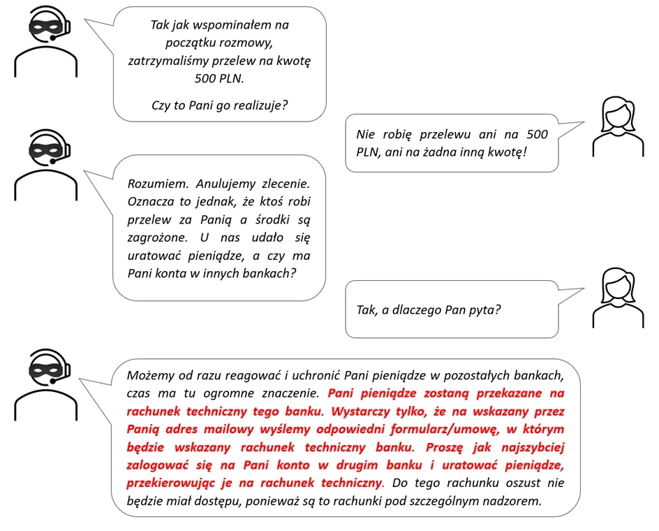 Po nawiązaniu połączenia telefonicznego i przekazaniu informacji orzekomym zagrożeniu dla naszych pieniędzy scenariusz może wyglądać tak: