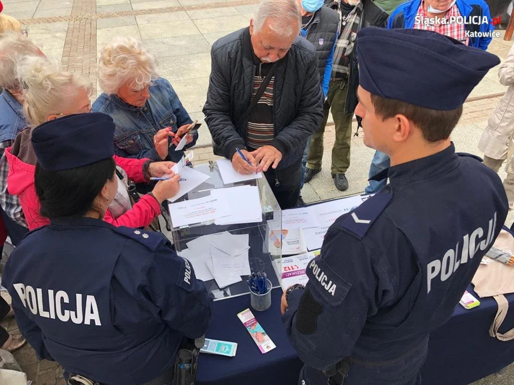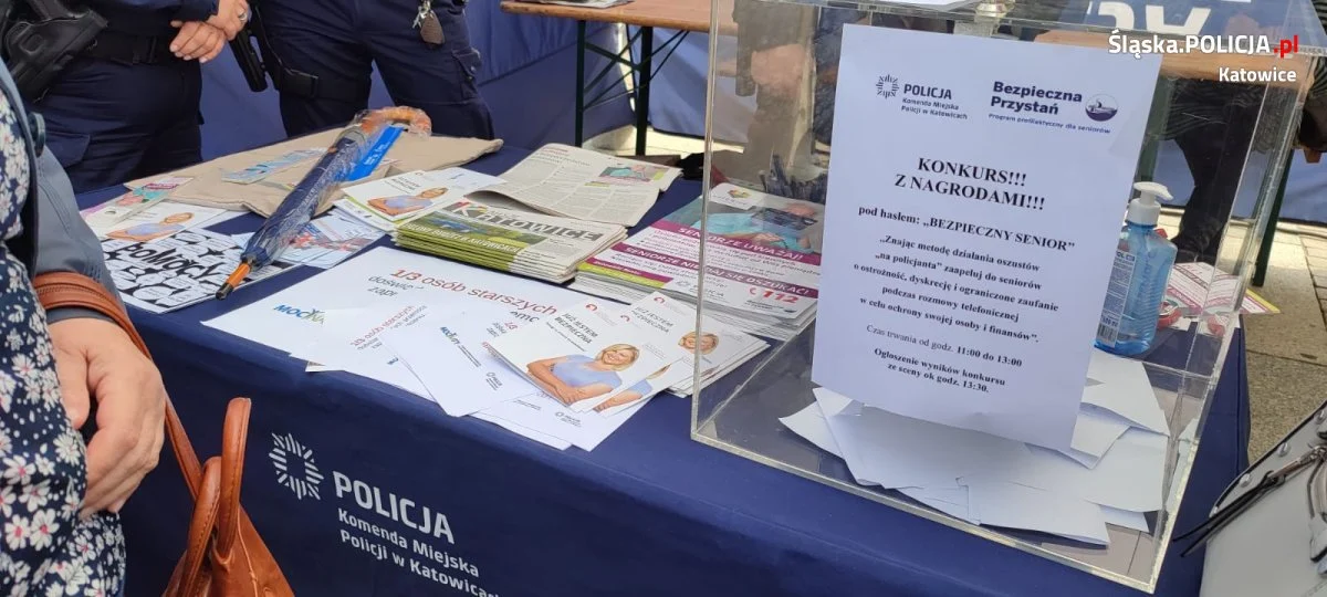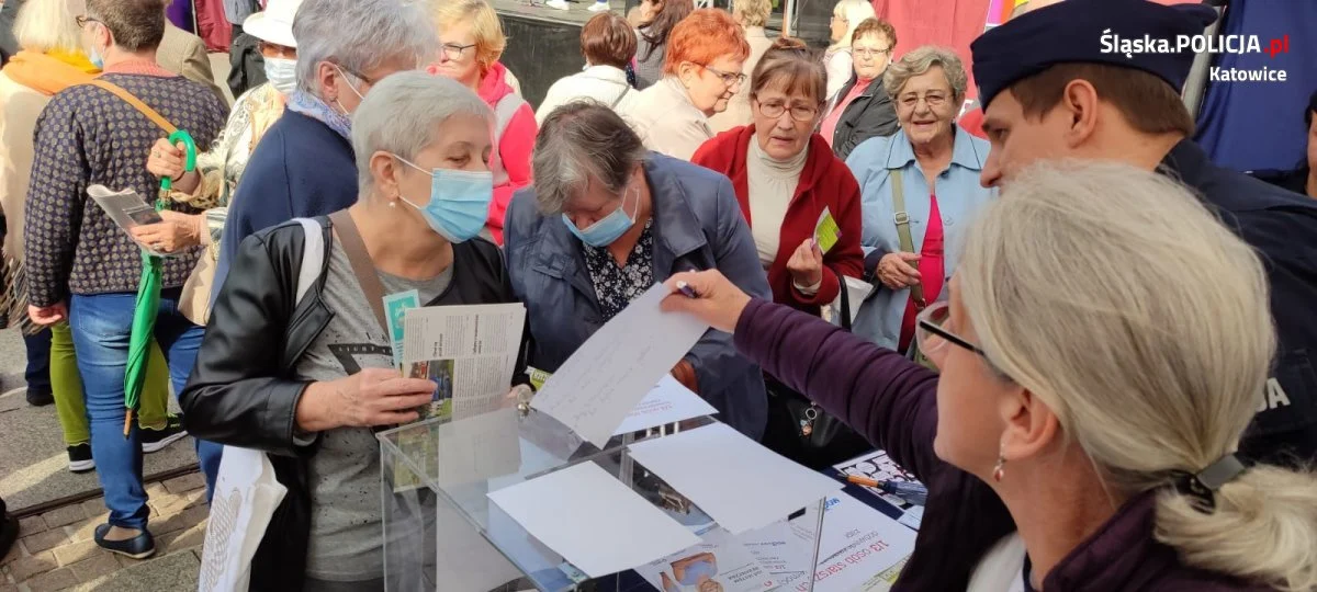 Katowicki Dzień Seniora zgromadził na Rynku wielu naszych seniorów. Święcie towarzyszyły występy artystyczne tj. koncerty, przedstawienia teatralne, projekcje filmowe oraz występy estradowe. Podczas wydarzenia katowiccy policjanci zorganizowali stanowisko profilaktyczne, na którym rozmawiali z seniorami o zagrożeniach, jak i bezpieczeństwie m.in.: w domu, przez telefon, czy w ruchu drogowym. Mundurowi mając na uwadze, że oszuści podszywający się pod policjantów wciąż działają i wyłudzają od seniorów wszystkie oszczędności przeprowadzili wśród najstarszych mieszkańców Katowic konkurs z nagrodami. Zadanie polegało na zaapelowaniu do seniorów o ostrożność, dyskrecję i ograniczone zaufanie podczas rozmowy telefonicznej w celu ochrony swojej osoby i finansów. Konkurs cieszył się wśród uczestników wydarzenia dużym zainteresowaniem. Każdy uczestnik konkursu dla zwiększenia swojego bezpieczeństwa otrzymał broszurę „Bezpieczny senior” oraz odblask. Do konkursu przystąpiło 36 osób, spośród których policjanci wyróżnili cztery osoby. Wyniki konkursu na dużej scenie ogłosiła policjantka koordynująca program profilaktyczny dla seniorów „Bezpieczna Przystań” Komendy Miejskiej Policji w Katowicach. Laureatów konkursu obdarowano m.in.: parasolami i torbami na zakupy z odblaskami oraz nazwą ww. programu, czy karty ICE.