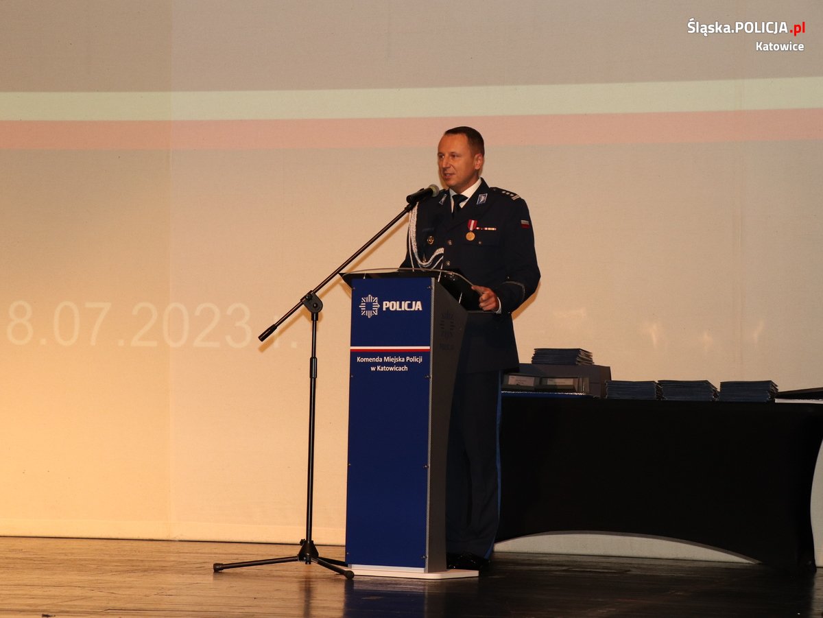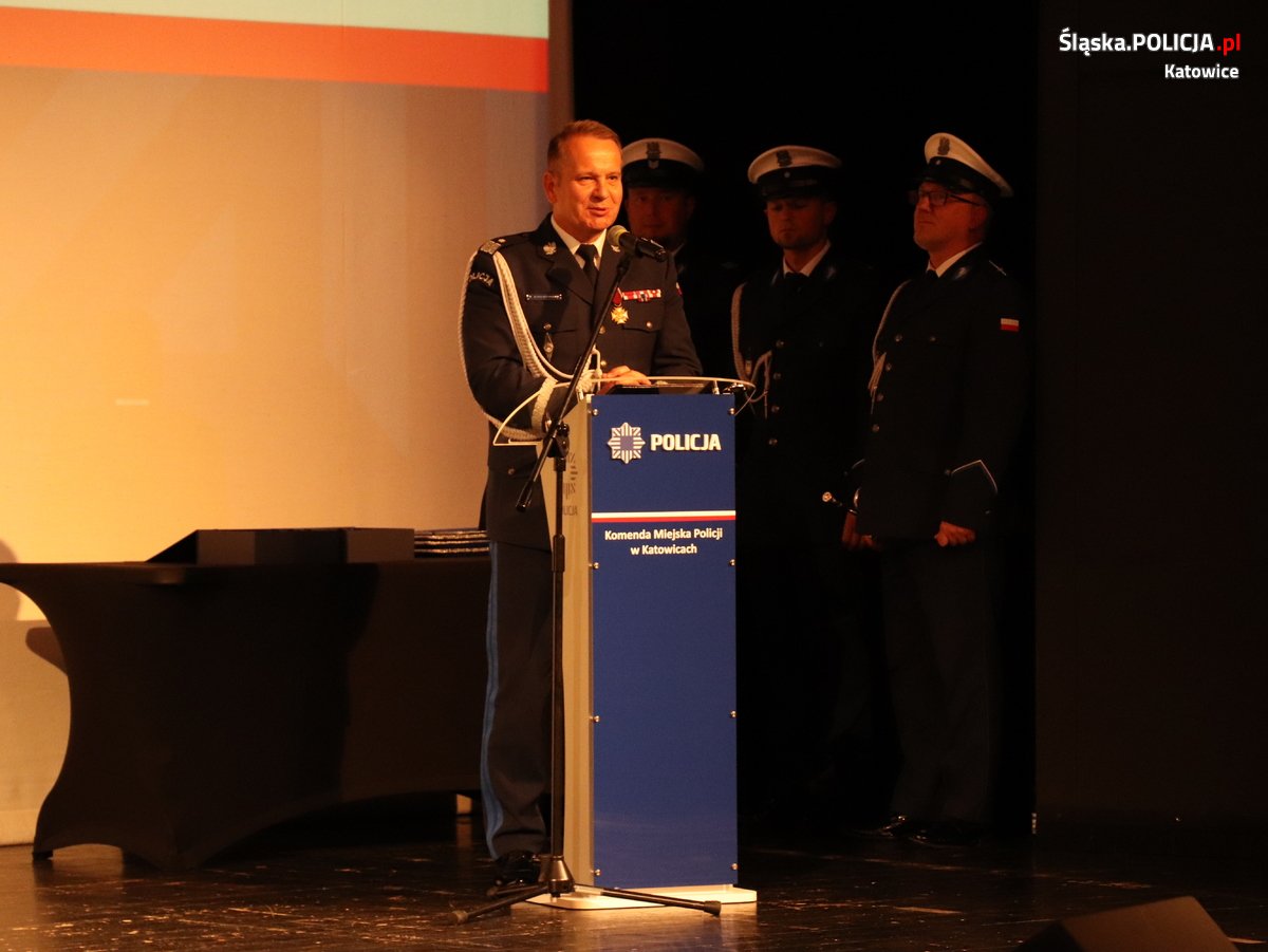 Następnie głos zabrał Komendant Miejski Policji w Katowicach insp. Arkadiusz Konowalski, który przywitał zgromadzonych gości. Komendant w swoim wystąpieniu podkreślił wagę i trudy codziennej służby policjantów, a także podziękował zaproszonym gościom za wsparcie i dobrą współpracę podczas działania na rzecz bezpieczeństwa obywateli Katowic. Komendant podziękował szczególnie policjantkom i policjantom oraz pracownikom cywilnym za wysiłek wkładany w codzienną służbę, która przekłada się na bezpieczeństwo mieszkańców, a także podkreślił, że tylko wspólne działanie może cały czas dawać możliwości rozwoju i poprawy.