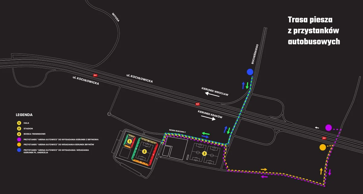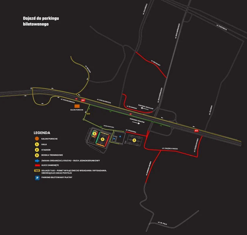 Uwaga: wjazd na teren parkingu możliwy będzie wyłącznie po okazaniu ważnego biletu parkingowego. Dojazd samochodem oraz taksówką (tak jak podczas pierwszego meczu – dojazd taxi wyłącznie na potrzeby wysiadania i wsiadania) odbywa się od strony ulicy Kochłowickiej, obok salonu Porsche, w kierunku ulicy Nowej Bukowej.