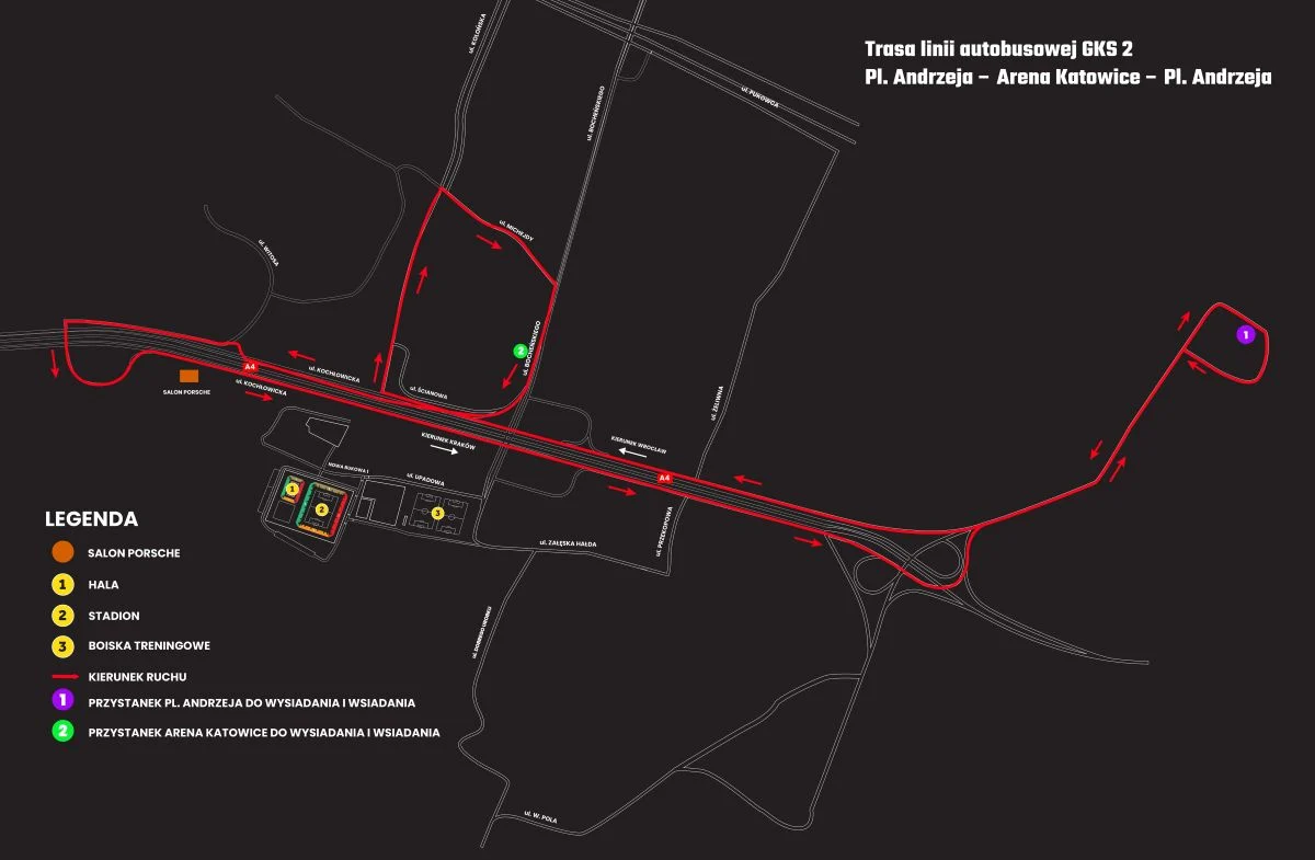 Ze względu na ograniczoną liczbę miejsc parkingowych oraz zmiany w organizacji ruchu w dniu meczu apelujemy do wszystkich uczestników wydarzenia, aby korzystali z transportu publicznego, w szczególności ze specjalnych darmowych linii autobusowych GKS 1 i GKS 2.