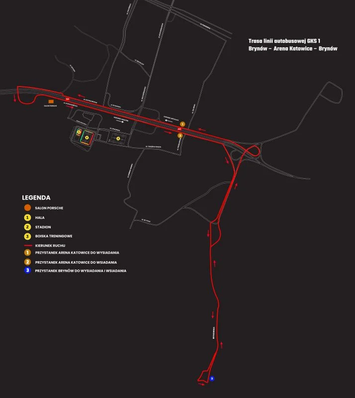 Podtrzymano dwie darmowe linie autobusowe dla kibiców, GKS 1 i GKS 2. Linia GKS 1 kursuje z przystanku zlokalizowanego przy Centrum Przesiadkowym Brynów. Przystanek ten pełni zarówno funkcję początkową, jak i końcową. Autobusy tej linii zatrzymują się przy ulicy Kochłowickiej. Przystanek służący do wysiadania znajduje się po stronie autostrady prowadzącej w kierunku Wrocławia. Z kolei przystanek przeznaczony do wsiadania zlokalizowany jest po przeciwnej stronie autostrady – w kierunku Krakowa. Kibice, którzy zdecydują się skorzystać z linii GKS 1, mogą dotrzeć na stadion pieszo, pokonując trasę przebiegającą od ulicy Żeliwnej, przez ulicę Przekopową a następnie ulicą Upadową aż do Nowej Bukowej.