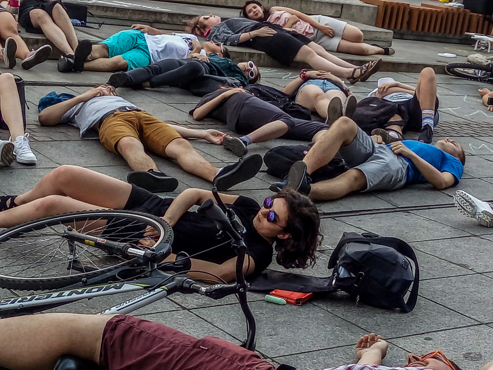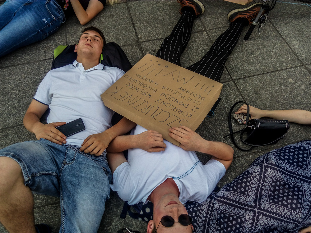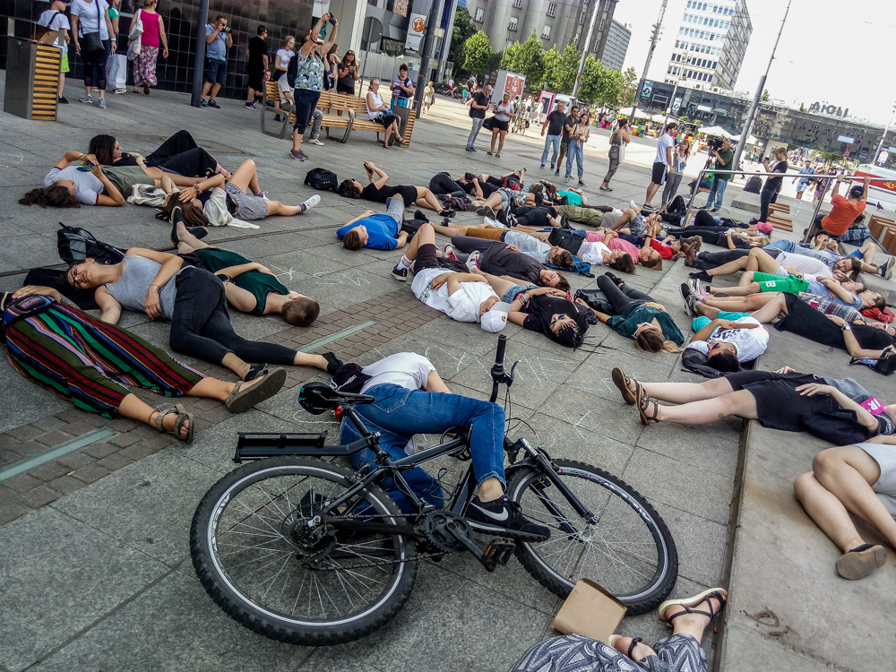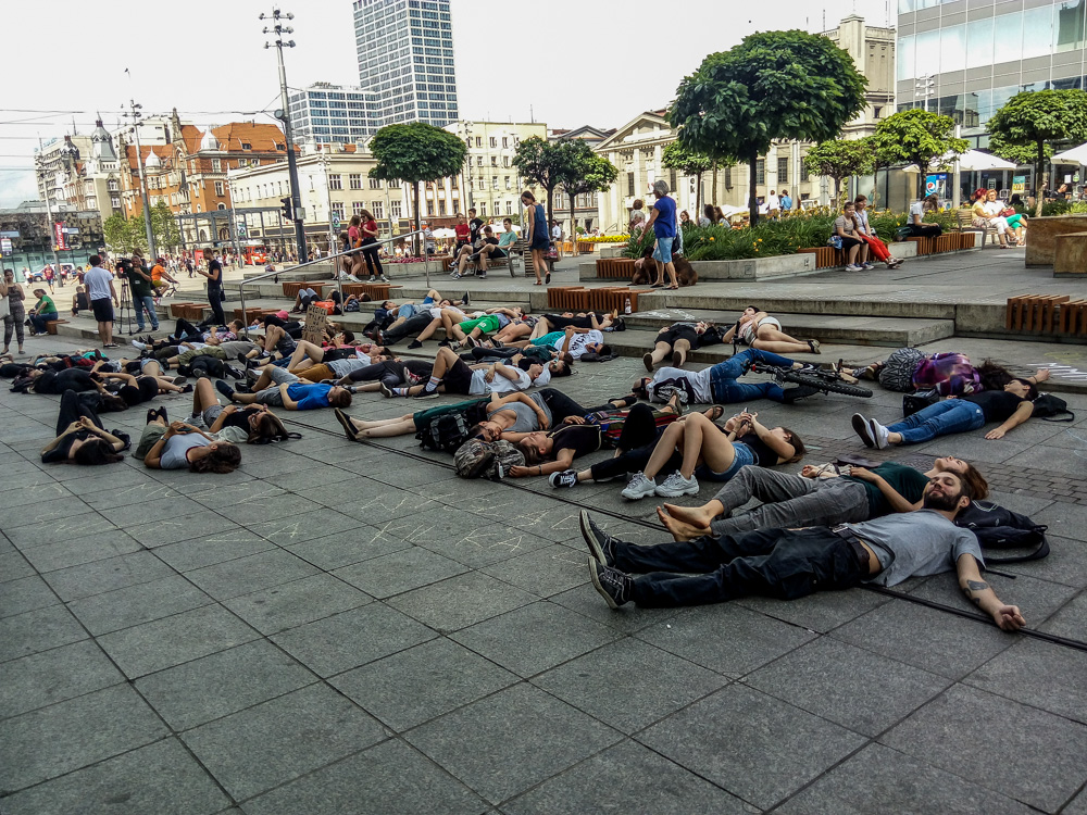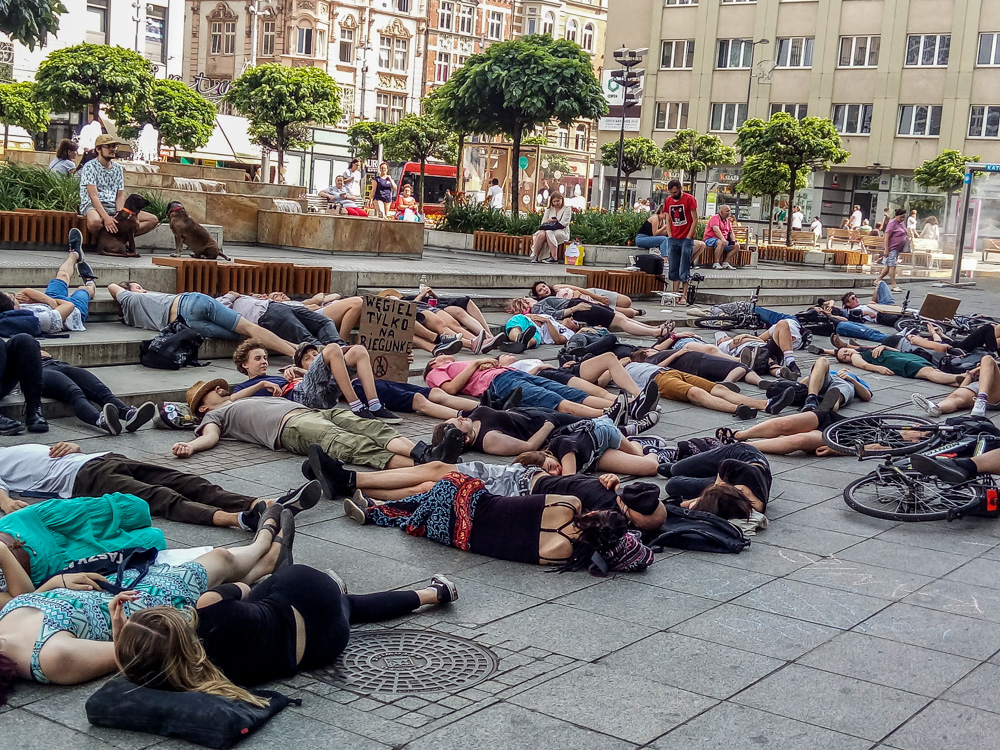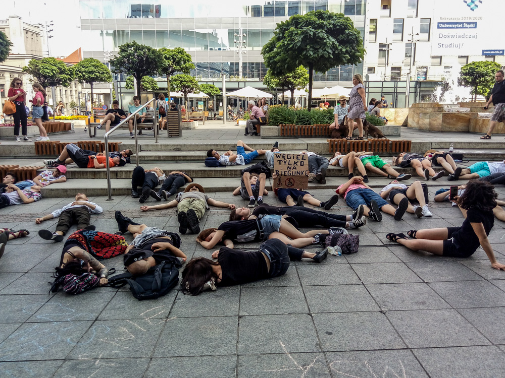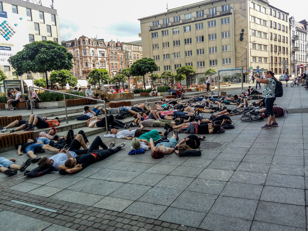 Kilkadziesiąt osób wzięło udział w specyficznym happeningu przed urzędem miasta w Katowicach. Na płycie rynku najpierw pojawił się tłum osób, a następnie każda z nich położyła się na ziemi, leżąc bez ruchu przez kilka, kilkanaście lub kilkadziesiąt minut.