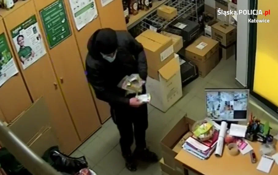 Kryminalni z Komisariatu IV Policji w Katowicach prowadzą czynności w sprawie włamania do sejfu i kradzieży pieniędzy. Do zdarzenia doszło 19 marca 2022 r. w sklepie spożywczym przy ulicy Szarych Szeregów w Katowicach. Podejrzewany mężczyzna używając klucza, którym nie miał prawa dysponować, otwarł sejf i skradł pieniądze w kwocie 6,8 tys. zł. Wizerunek sprawcy zarejestrował sklepowy monitoring.