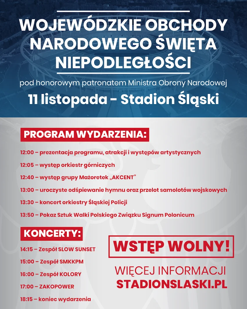 Wojewódzkie Obchody Narodowego Święta Niepodległości na Stadionie Śląskim odbędą się 11 listopada. Wstęp na teren imprezy możliwy będzie od godziny 12:00. O godzinie 13:00 wszyscy zgromadzeni odśpiewają hymn narodowy. Zarówno wejście jak i wszelkie atrakcje będą darmowe. Więcej informacji o wydarzeniu znaleźć można na stronie stadionslaski.pl oraz w mediach społecznościowych obiektu.