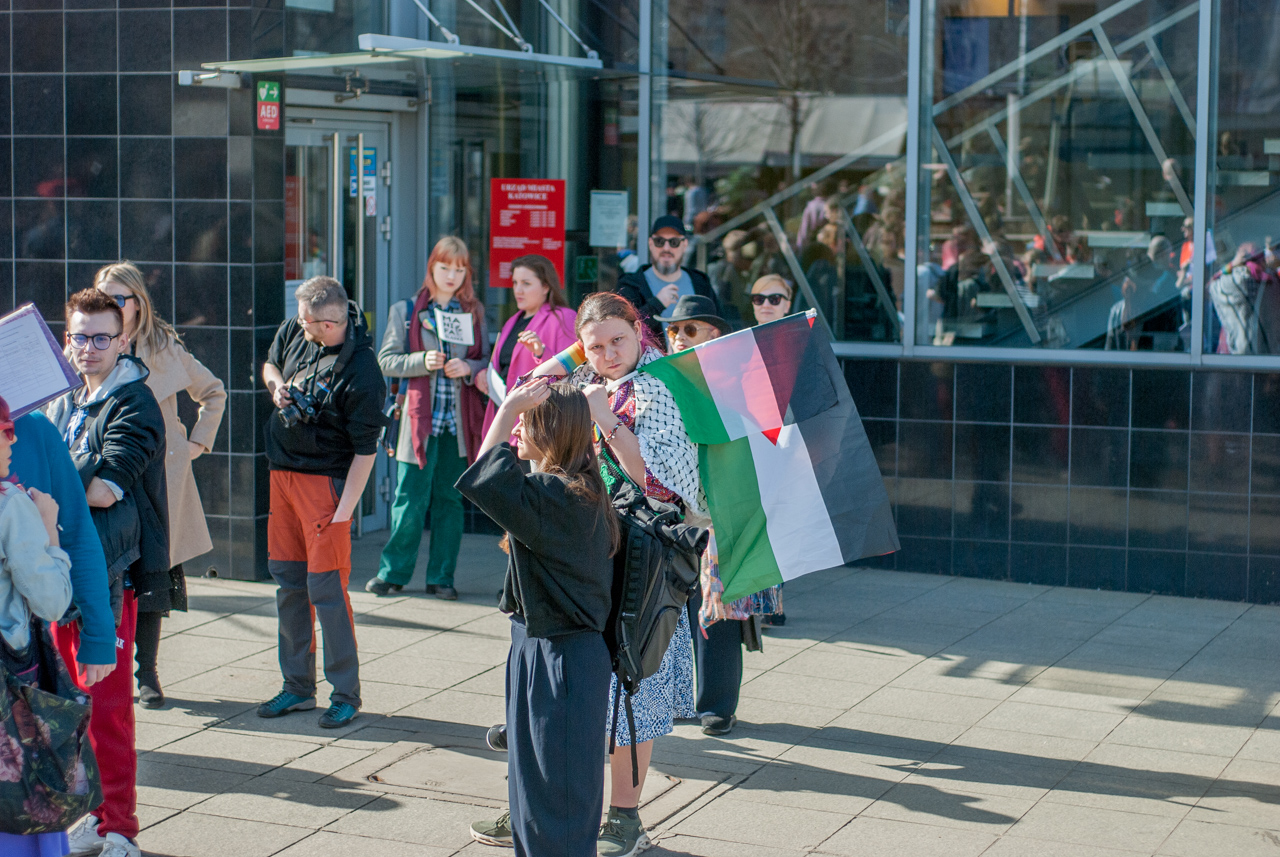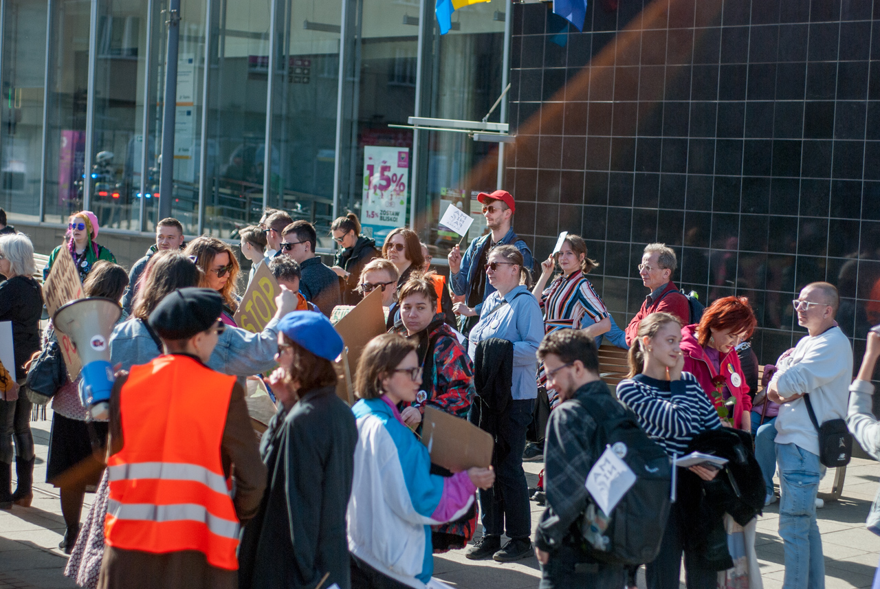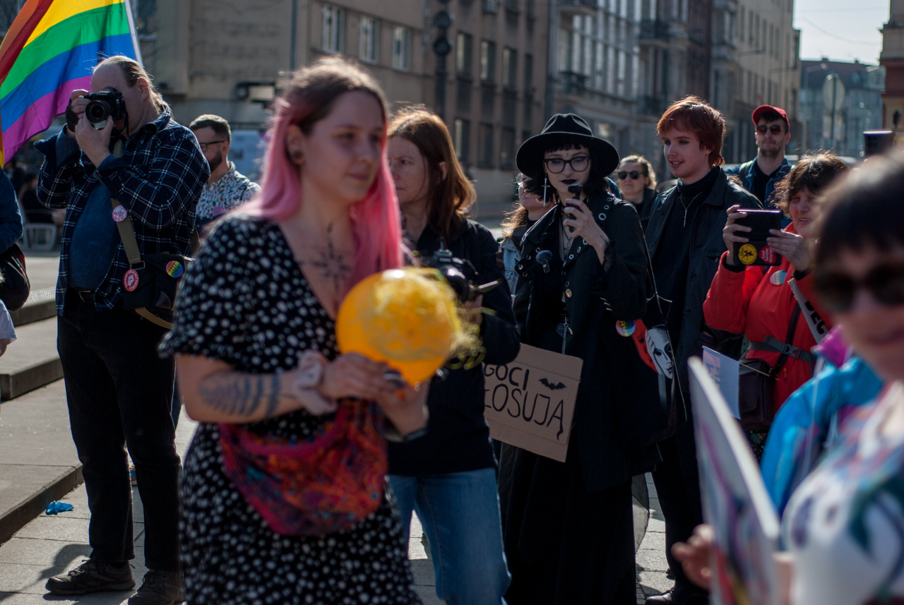 Nie obyło się, niestety, bez przykrych incydentów. W pewnym momencie uczestników zgromadzenia werbalnie zaatakowała starsza kobieta, mówiąc, że są nienormalni, że tu jest Polska i Pan Bóg ich ukaże. Z naszych zdjęć wiemy, że była uczestniczką pobliskiego zgromadzenia. Na płycie rynku rozstawili się bowiem przeciwnicy aborcji z obrazoburczym, nieprzyjemnym transparentem, mającym obrazować abortowane dziecko. Nie licząc agresywnej kobiety, pozostali byli jednak bardzo spokojni, modlili się, używając nagłośnienia, ale nie ingerowali w przebieg odbywających się obok Manify