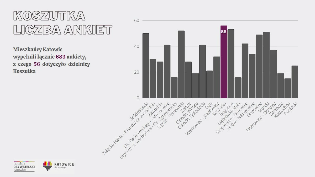428 ankiet zostało zgłoszonych za pomocą formularza online, a 255 w formie papierowej. Ankiety papierowe można było zostawiać w filiach Miejskiej Biblioteki Publicznej i Miejskich Domach Kultury, łącznie w 45 miejscach zlokalizowanych na terenie całego miasta. Najwięcej ze zgłoszonych ankiet dotyczyło Koszutki – 55, Bogucic – 53 i Ligoty-Panewnik – 52. Natomiast najbardziej aktywną grupą wiekową w zgłaszaniu pomysłów były osoby mieszczące się w przedziale wiekowym 35-44 – wskazuje Justyna Buchalik, naczelnik wydziału komunikacji społecznej w Urzędzie Miasta Katowice.