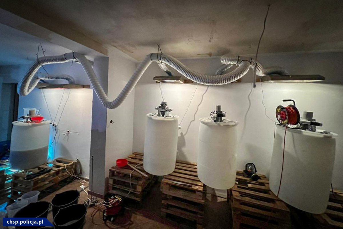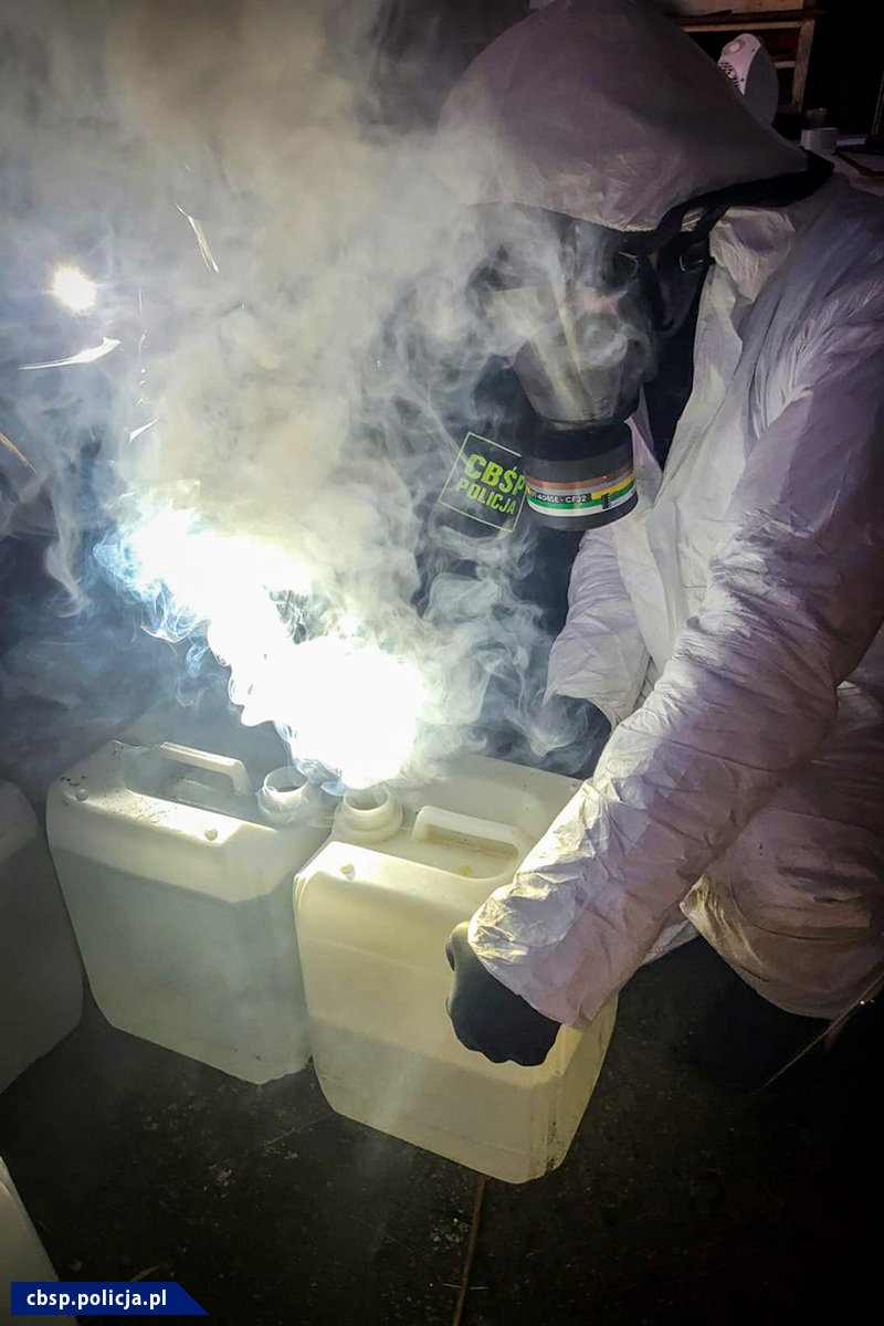 Ponadto na miejscu zabezpieczono prawie 5 ton różnego rodzaju substancji chemicznych niezbędnych do procesu produkcyjnego, w tym prekursorów narkotykowych przechowywanych w kanistrach, a także maski pełnotwarzowe, urządzenia do ważenia i porcjowania gotowego narkotyku i wiele innych dowodów przestępczej działalności.