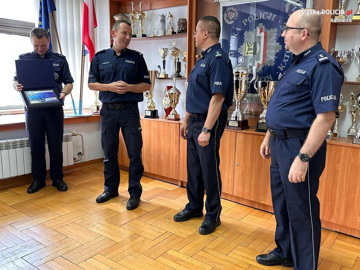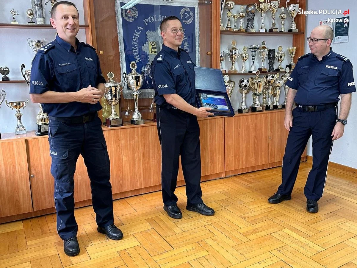 Podczas uroczystej zbiórki Komendant Miejski Policji w Katowicach insp. Arkadiusz Konowalski wraz ze swoimi zastępcą mł. insp. Arkadiuszem Stępniem podziękowali mł. insp. Krzysztofowi Austowi za służbę w katowickim garnizonie, złożyli gratulacje i życzyli samych sukcesów na nowym stanowisku.