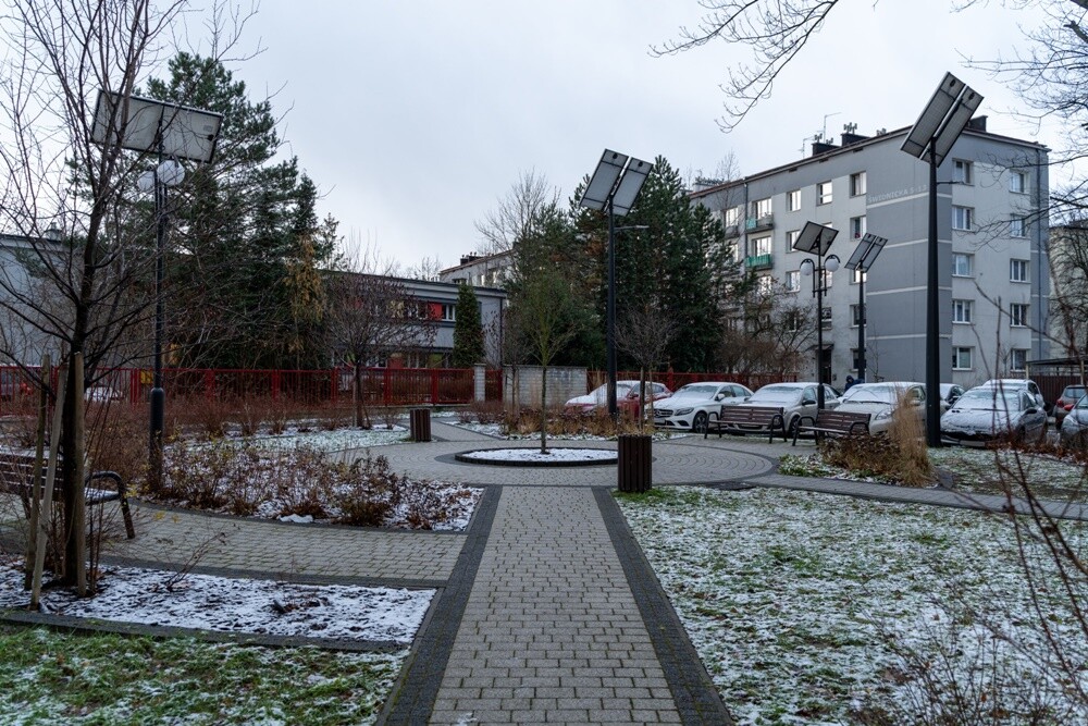 Inwestycja rozpoczęta we wrześniu 2023 r. objęła prace związane z przebudową kanalizacji deszczowej oraz infrastrukturą dla samochodów – wyremontowano drogi dojazdowe oraz wyznaczono 12 miejsc parkingowych, w tym 2 dla osób niepełnosprawnych. W ramach robót przeprowadzono też remont części istniejących i budowę nowych chodników oraz zamontowano elementy małej architektury. Całość dopełniła rekultywacja terenów zielonych, na których nasadzone zostały krzewy takich gatunków jak tawuła, lilak, dereń czy berberys. Łącznie teren objęty inwestycją ma powierzchnię około 3 000 m2, w tym tereny zielone to blisko 800 m2.