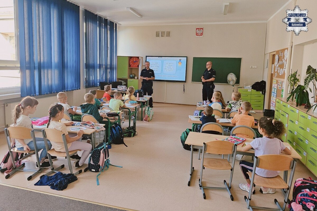 Katowiccy policjanci w ramach działań „Błyskotliwy pierwszak, czyli bezpieczna droga do szkoły” prowadzą zajęcia z pierwszoklasistami. Tym razem dzielnicowi i profilaktyk odwiedzili trzy szkoły podstawowe. Mundurowi uczyli dzieci przepisów ruchu drogowego i bezpiecznego przechodzenia przez jezdnię.