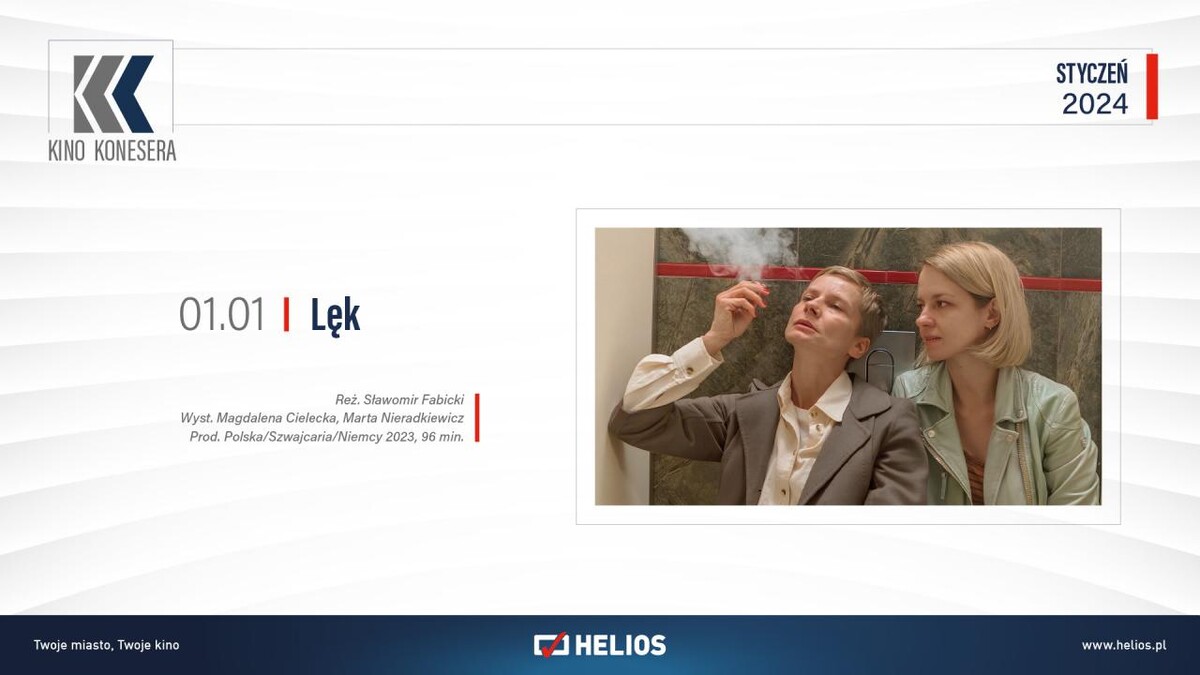 W Nowy Rok warto udać się do kin Helios na dramat „Lęk” wyświetlany w ramach projektu Kino Konesera. Dwie siostry wyruszają w pełną emocji podróż, poprzez śmiech i łzy, radość i gniew, aż do finału, który ma rozstrzygnąć o losie jednej z nich. W rolach głównych: Magdalena Cielecka, Marta Nieradkiewicz, Adrian Kłos.