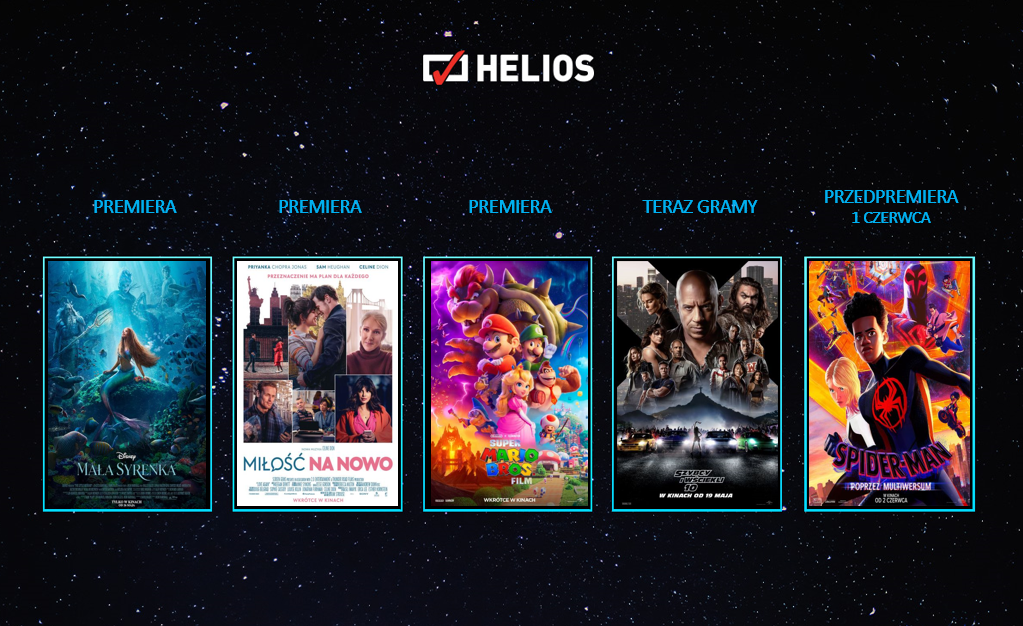 Najnowszy, pełen premierowych produkcji, repertuar sieci Helios z pewnością spełni oczekiwania wszystkich kinomanów. Na ekranach kin królować będą filmy familijne: „Mała Syrenka” oraz „Super Mario Bros. Film”, a także komedie: „Miłość na nowo” oraz „Mafia Mamma”. Wśród filmowych propozycji nie zabraknie brawurowej produkcji w gwiazdorskiej obsadzie „Szybcy i wściekli 10”, jak również przedpremierowych pokazów światowego hitu „Spider-man. Poprzez multiwersum”.