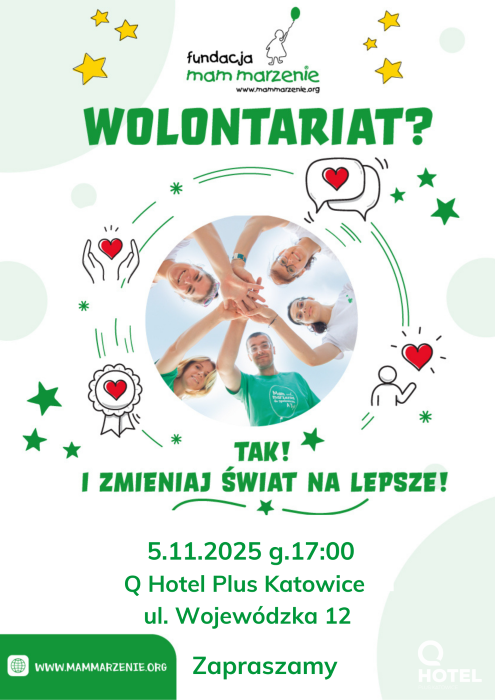 Spotkania informacyjne dla nowych wolontariuszy odbędą się 5 listopada i 3 grudnia 2025 o godz. 17:00 w Q Hotel Plus Katowice (ul. Wojewódzka 12).