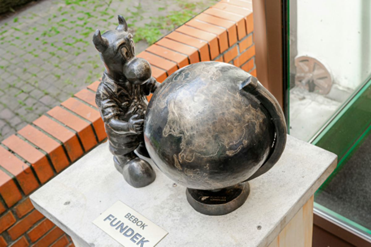 Przy ulicy Sokolskiej 8 w Katowicach – przed siedzibą Funduszu Górnośląskiego – stanął Fundek. Nowy katowicki bebok jest ciekawy świata i gotowy na biznesową ekspansję – dlatego odważnie trzyma w rękach i ogląda duży globus.