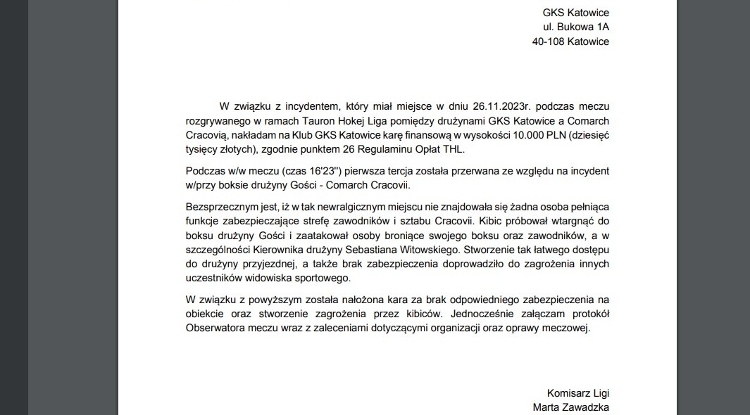W związku z incydentem, który miał miejsce w dniu 26.11.2023 r. podczas meczu rozgrywanego w ramach Tauron Hokej Liga pomiędzy drużynami GKS Katowice a Comarch Cracovią, nakładam na Klub GKS Katowice karę finansową w wysokości 10.000 PLN (dziesięć tysięcy złotych), zgodnie punktem 26 Regulaminu Opłat THL.