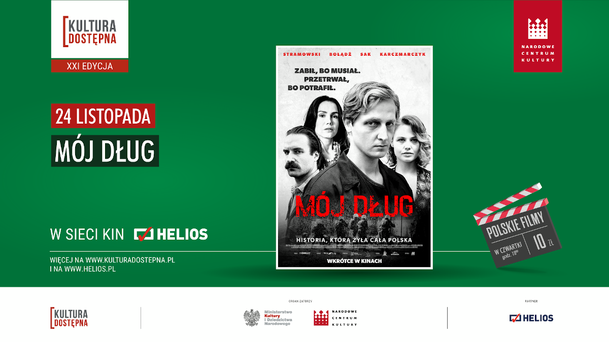 24 listopada w ramach cyklu Kultura Dostępna na fanów polskiego kina czeka kryminał „Mój dług”. Młody przedsiębiorca prześladowany przez bezwzględnego bandytę dopuszcza się morderstwa w obronie swoich najbliższych. Skazany na 25 lat więzienia trafia za kraty, gdzie musi walczyć o przetrwanie.