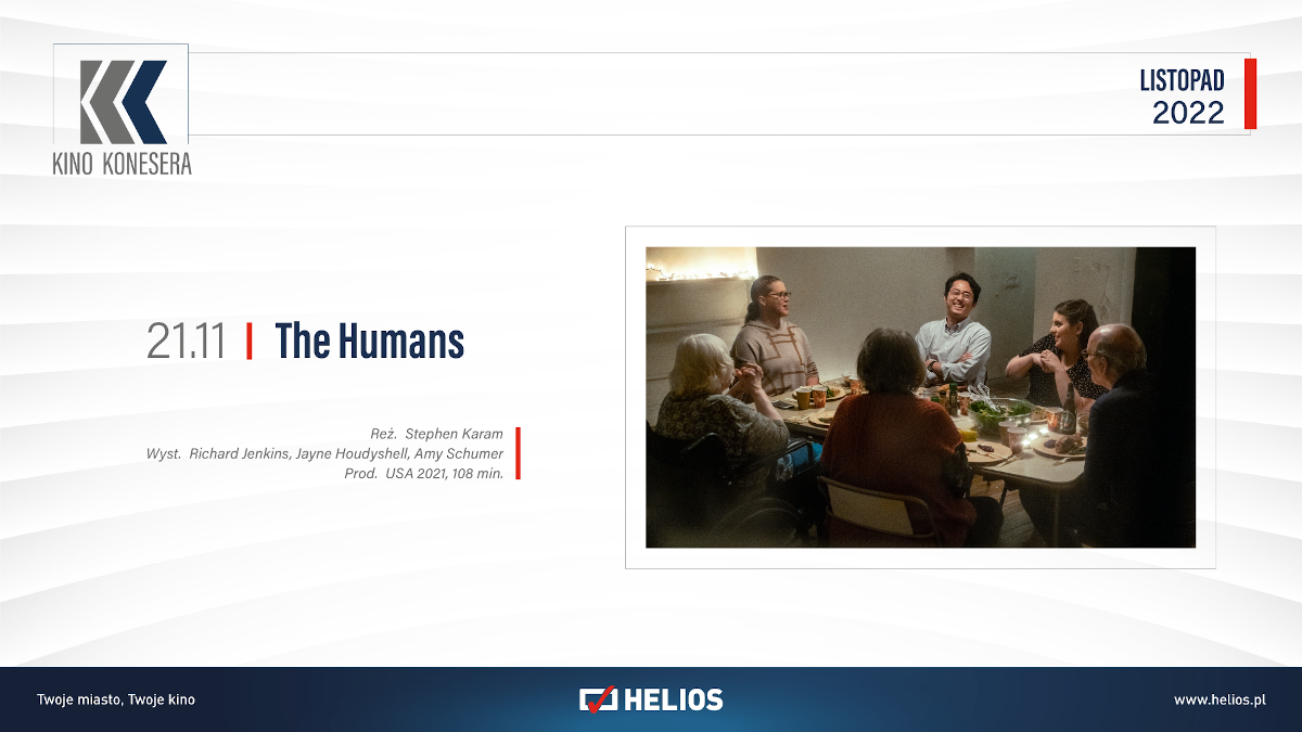 21 listopada w Kinie Konesera zaprezentowany zostanie amerykański dramat „The Humans”. Gdy trzy pokolenia Blake’ów spotkają się przy jednym stole, właściwie nic nie pójdzie już zgodnie z planem. Z każdym kolejnym daniem atmosfera przy stole gęstnieje, a cięte riposty trafiają w coraz bardziej czułe miejsca, jeden z członków rodziny decyduje się na szczere wyznanie...