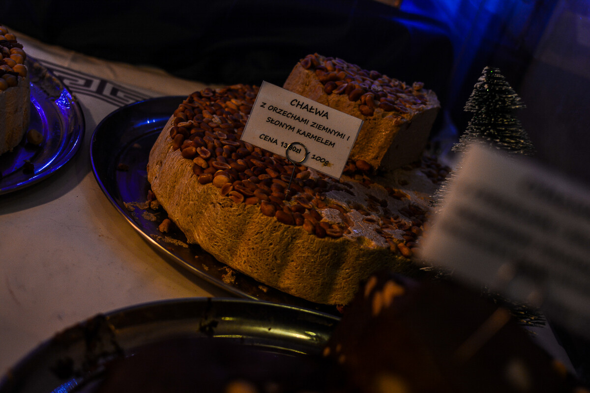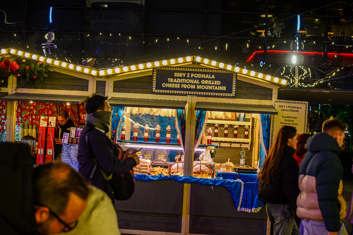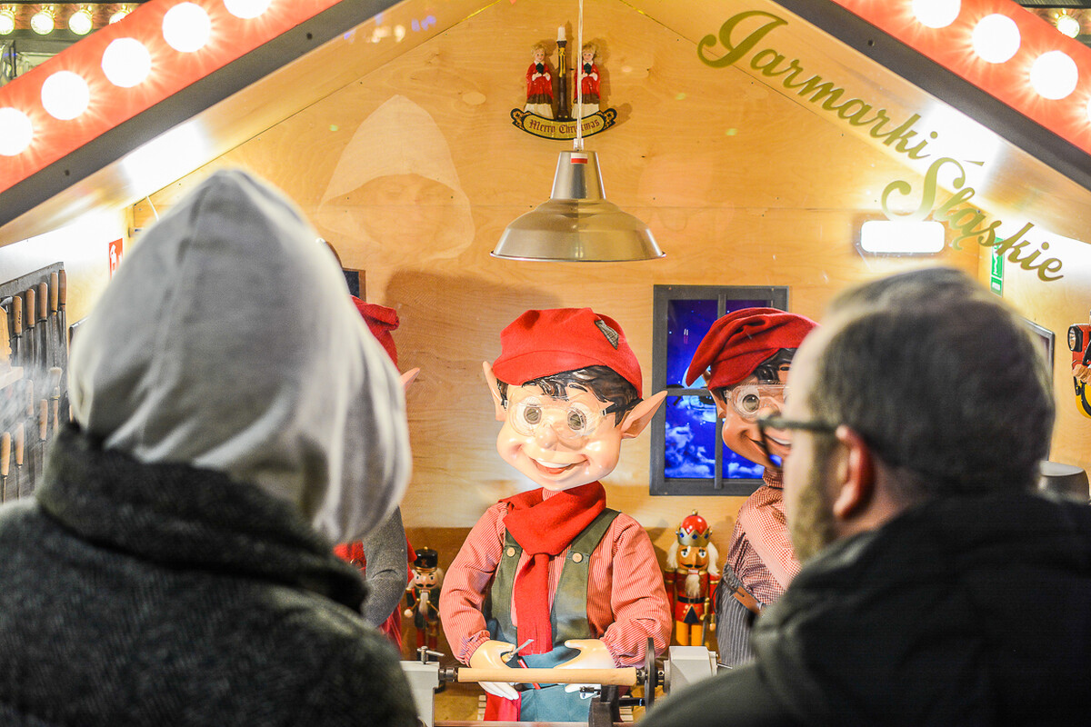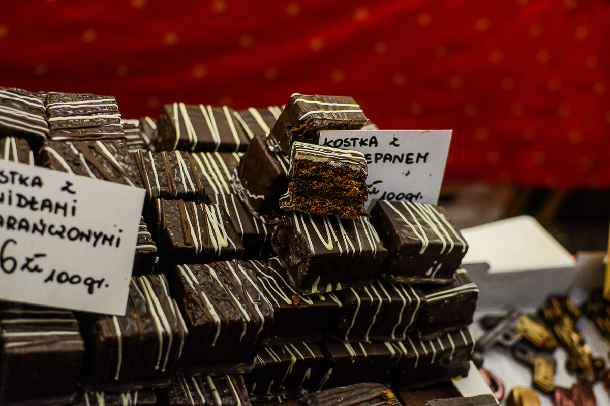 Na samej płycie rynku znajdziemy kilkadziesiąt budek z świątecznymi cukierkami, owocami w czekoladzie, chałwą, przetworami i wiejskimi produktami, nalewkami czy ciepłymi przekąskami (królują oscypki, bigos i kiełbaski). No i oczywiście grzaniec w kilku odsłonach, po który zwykle stoją kolejki. Do tego dochodzi cała masa wzorzystych skarpet, czapek i bucików, zabawki i bibeloty, czyli wszystko to, co małe, kolorowe i cieszące oko.