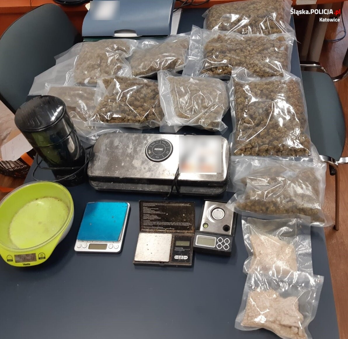 Podczas przeszukań zabezpieczono ponad 7 kilogramów marihuany, ponad 900 gramów metaamfetaminy oraz 640 tabletek ecstasy. Oprócz narkotyków funkcjonariusze znaleźli pistolet maszynowy CZ Scorpion wraz z amunicją oraz ponad 55 tysięcy złotych w gotówce, które zabezpieczono na poczet przyszłych kar.