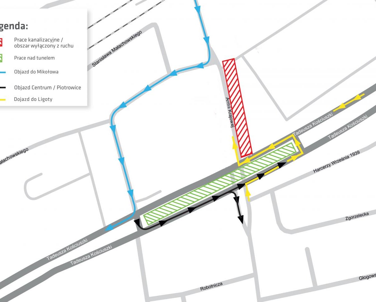 Od 14 kwietnia wykonawca nadal będzie prowadził prace związane z budową węzła drogowego wzdłuż ul. Armii Krajowej na odcinku od skrzyżowania z ul. Kościuszki do ul. Małachowskiego, przy czym po drugiej stronie jezdni. Wyłączony z ruchu zostanie pas ruchu na kierunku od Piotrowic do Ligoty, przy czym objazd pozostanie na dotychczasowych zasadach. W tym okresie fragment ul. Armii Krajowej będzie nadal jednokierunkowy, a kierowcy jadący od strony Ligoty będą prowadzeni objazdem ul. Małachowskiego. Ruch w kierunku Ligoty utrzymany będzie ul. Armii Krajowej – wyjaśnia Ewa Lipka, rzecznik prasowy urzędu miasta i dodaje, że po zakończeniu tego etapu prac wykonawca będzie musiał przeprowadzić analogiczne także od strony Piotrowic.