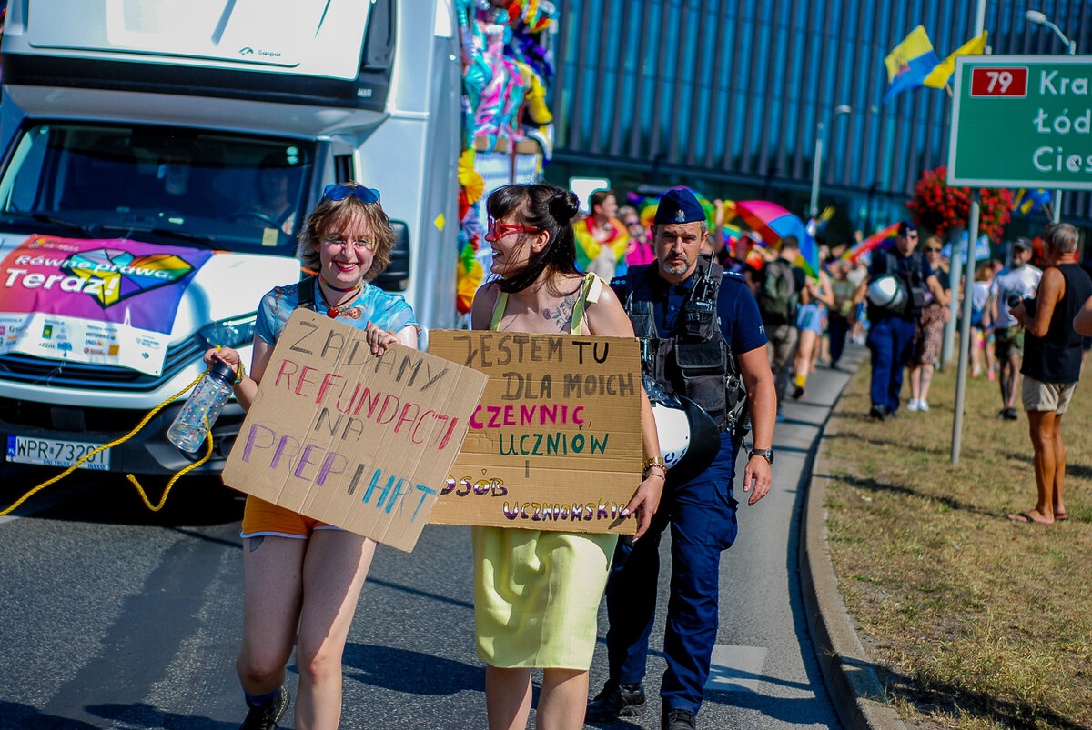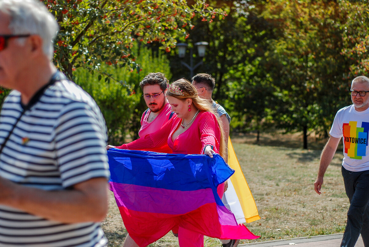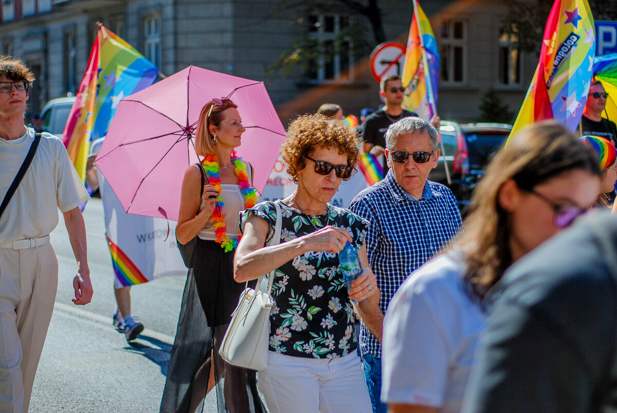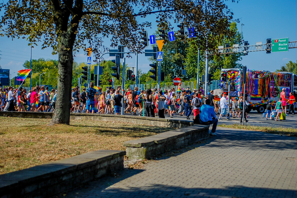Barwny i głośny korowód wystartował około 13.30, zagłuszając emitowane przez megafony komunikaty przeciwników marszu (m.in. przedstawicieli środowisk pro-life), pozdrawiając ich serdecznie i ruszył w trasę po śródmieściu. Aleja Korfantego, ul. Piotra Skargi, Słowackiego, 3 Maja, pl. Wolności, Sokolska, Morcinka i powrót na miejsce wymarszu. Cało poszła sprawnie, szybko i bez większych problemów. “Tsunami równości” gładko przelało się przez centrum.