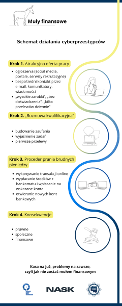 Nieświadoma osoba wykonująca te działania staje się częścią procederu prania pieniędzy, co może skutkować poważnymi konsekwencjami prawnymi. Przestępcy często zrywają kontakt z „pracownikiem” po osiągnięciu swoich celów, a osoby zaangażowane w ten proceder mogą zdać sobie sprawę, że zostały oszukane dopiero po fakcie, gdy jest już za późno, aby uniknąć odpowiedzialności.
