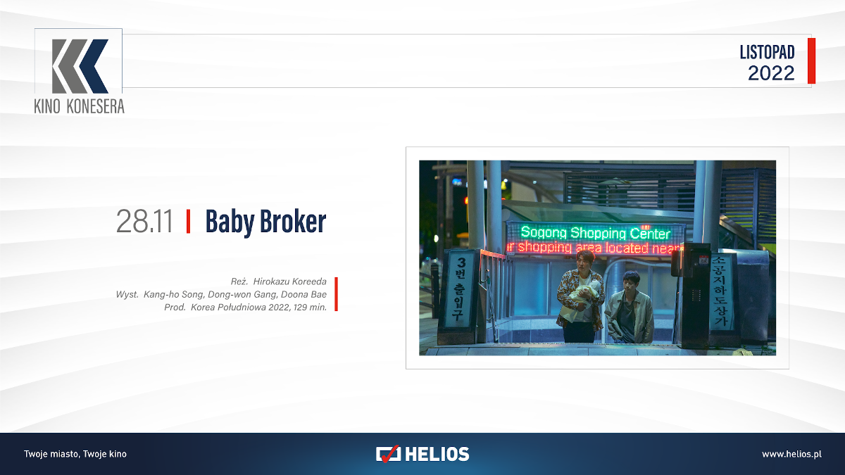 28 listopada w cyklu Kino Konesera zaprezentowany zostanie koreański dramat „Baby Broker”. Dwaj główni bohaterowie, to tytułowi pośrednicy pomiędzy oknem życia, a rodzicami starającymi się o adopcję. Pomijają przy tym wszelkie procedury, inkasując duże pieniądze. Po jednego z niemowlaków do okna życia wraca jednak matka, co komplikuje plan zarobku, a na horyzoncie czai się już policja...