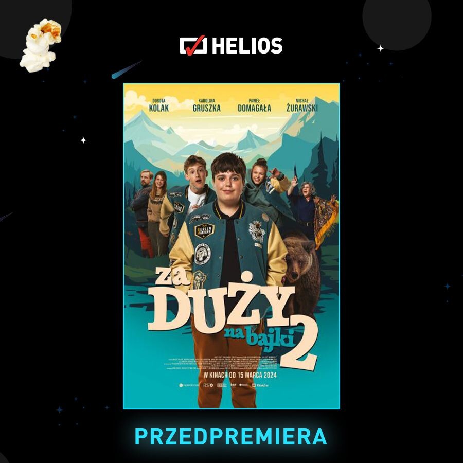 W nadchodzącym tygodniu na ekrany kin Helios zawitają także przedpremierowe seanse filmu familijnego „Za duży na bajki 2”. Podczas wycieczki w Tatry Waldek przypadkowo dowiaduje się, że w okolicy mieszka jego ojciec, który nie utrzymuje kontaktu z rodziną. Chłopiec postanawia za wszelką cenę go odnaleźć i osobiście zapytać o powody tej decyzji. W tej trudnej misji może liczyć na pomoc przyjaciół – Staszka i Delfiny!