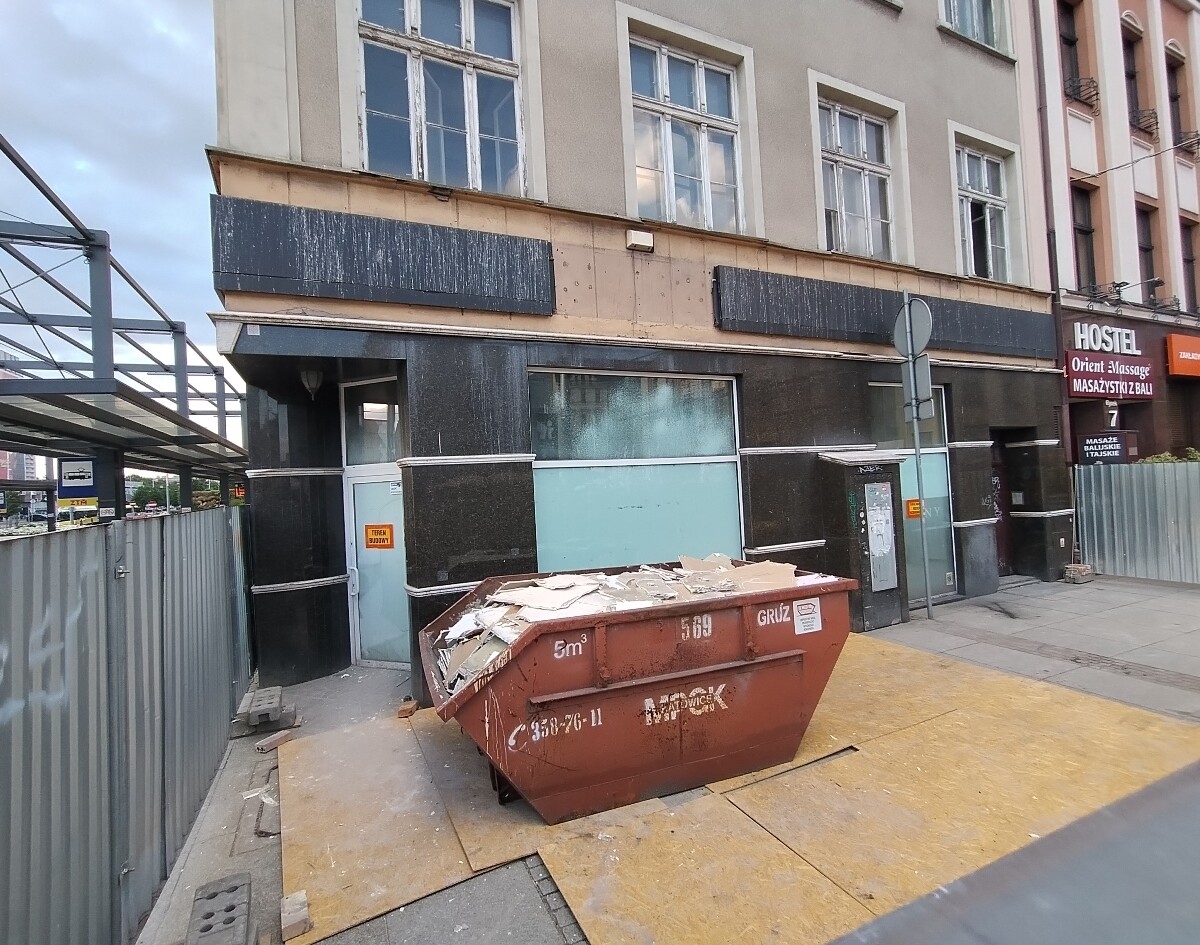 Cały parter budynku zasłonięty jest przez metalowe ogrodzenie, na osłoniętym placyku stoi kontener na gruz, a w oknie znajdziemy tablicę informacyjną, zdradzająca informację, kto jest nowym inwestorem. Prace postępują.