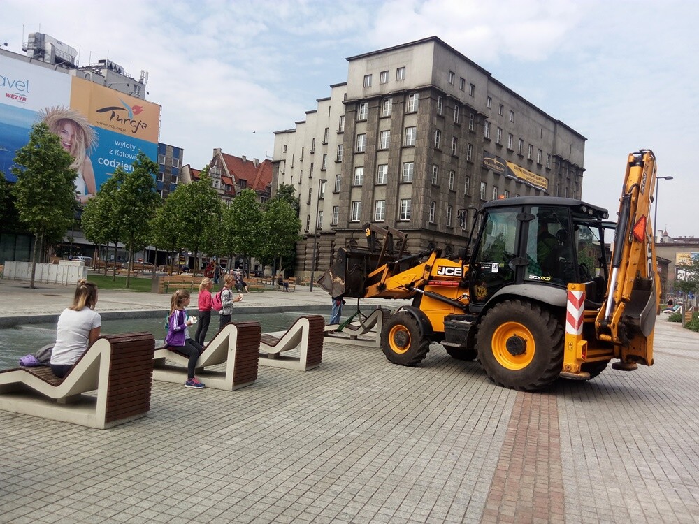 Cztery potężne palmy przywieziono samochodami i wypakowano niewielkim dźwigiem (i koparką). Sprzęt pojawił się na rynku około godziny 10. Drzewa mają się dobrze, ale słoneczne i ciepłe miesiące dodatkowo poprawią ich kondycję.