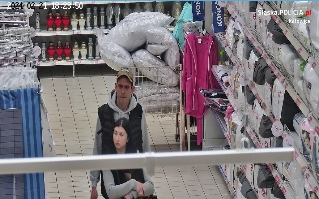 Widoczni na zdjęciach kobieta i mężczyzna w markecie przy ulicy Nikodema i Józefa Renców w Katowicach, ukradli alkohol o wartości prawie 2 tys. zł. Wizerunek podejrzanych zarejestrował monitoring.