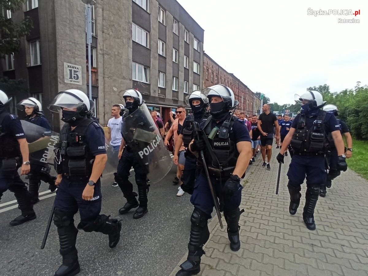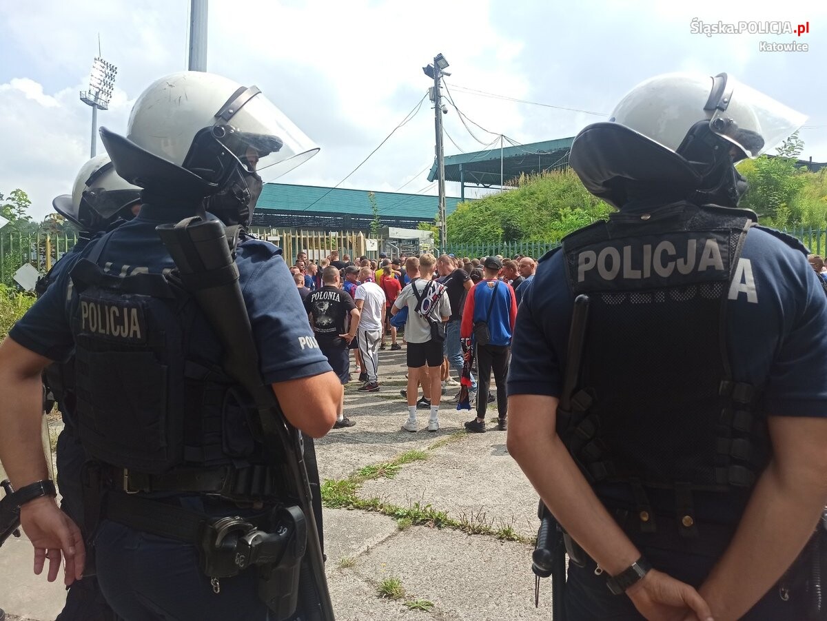 Policjanci z Komendy Miejskiej Policji w Katowicach wspólnie z mundurowymi z katowickiego oddziału prewencji i częstochowskiego samodzielnego pododdziału prewencji zabezpieczali w niedzielę mecz piłki nożnej. Podczas spotkania rozgrywanego na stadionie przy ul. Bukowej, GKS Katowice podejmował Arkę Gdynia. W trakcie zabezpieczenia dwie osoby złamały prawo.