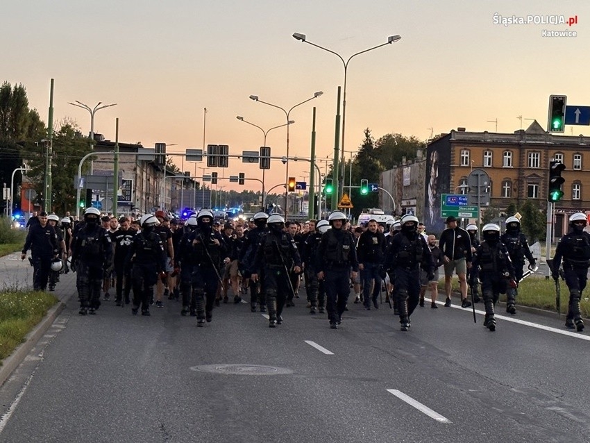 Policjanci z Komendy Miejskiej Policji w Katowicach wspólnie z mundurowymi z katowickiego oddziału prewencji oraz bielskiego i częstochowskiego samodzielnego pododdziału prewencji zabezpieczali w piątek mecz piłki nożnej.