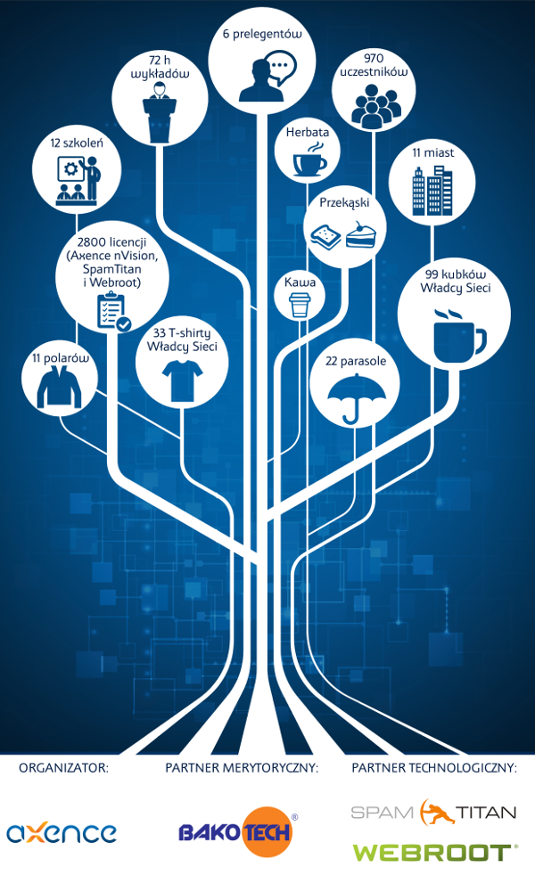 Szkolenia, skierowane do osób zainteresowanych podnoszeniem poziomu bezpieczeństwa infrastruktury IT, zorganizowane zostały w 11 największych miastach Polski. Organizatorem szkoleń była firma Axence, oferująca oprogramowanie do kompleksowego zarządzania siecią firmową, przy współpracy z Bakotech, SpamTitan i Webroot.