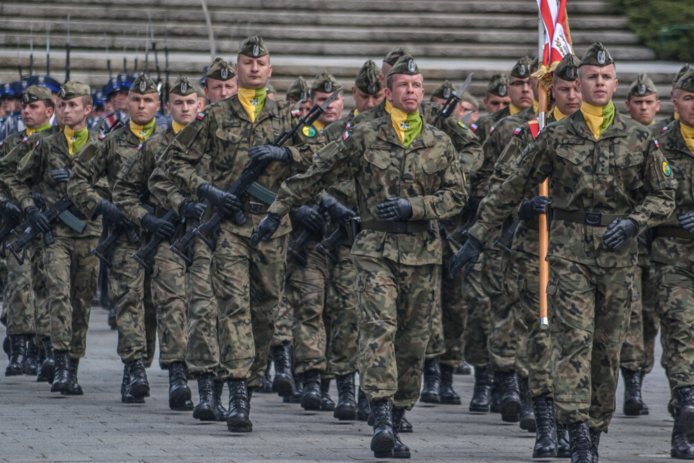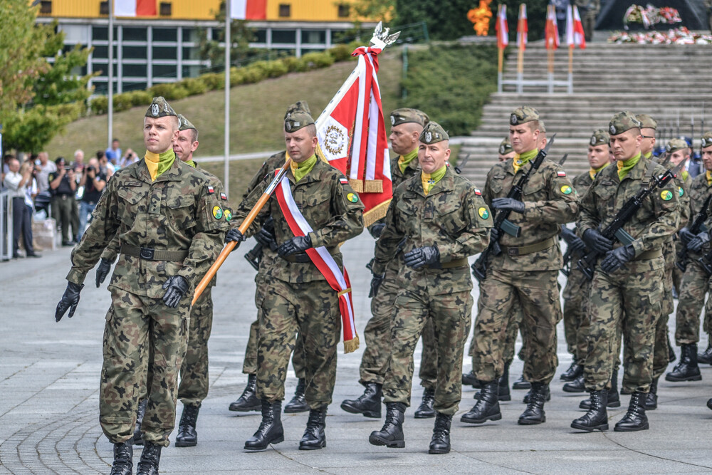Na os. Paderewskiego, na placu przed pomnikiem Żołnierza Polskiego złożono dziś kwiaty, wywieszono flagi, a przed widzami przedefilowały służby mundurowe.