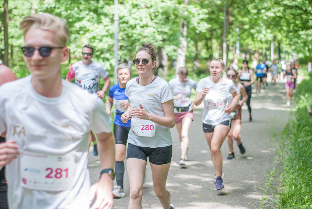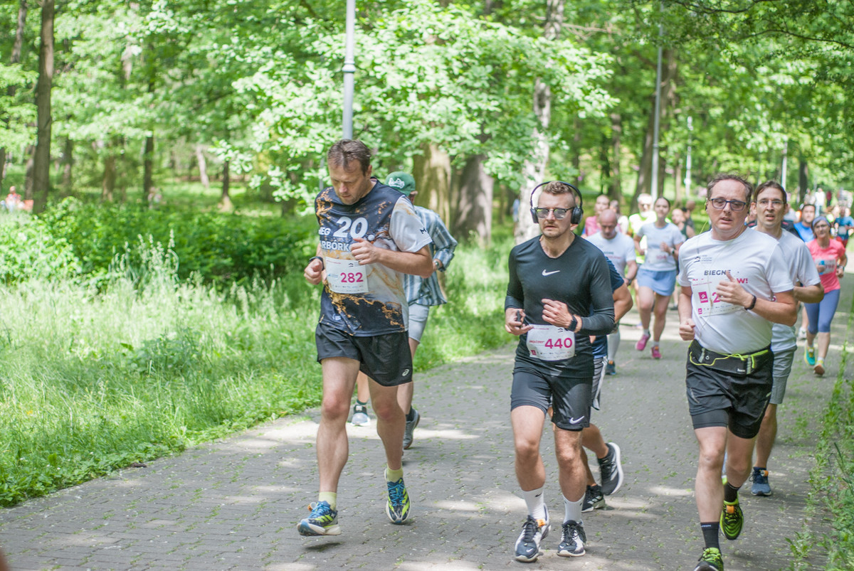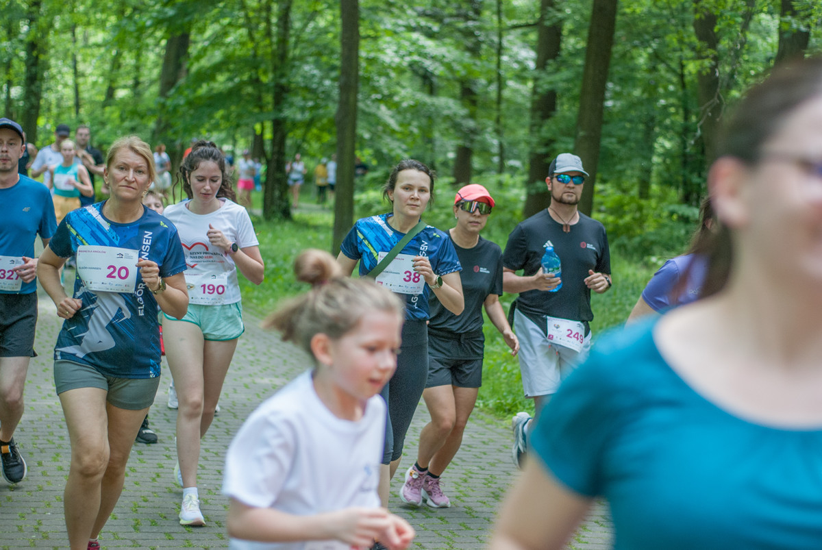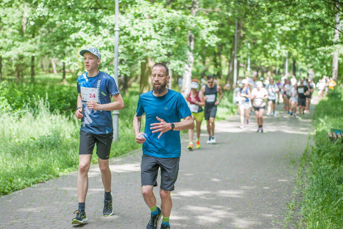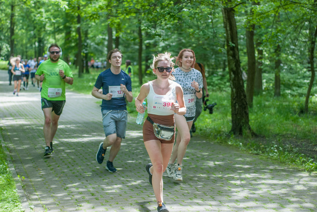 O 11:30 wystartowali zawodnicy biorący udział w biegu głównym na dystansie 5 km. Czekały na nich dwie pętle liczące 2,5 km, prowadzące po trasie którą standardowo, co sobotę, truchtają uczestnicy parkrun Katowice. Tu uczestników było już kilkuset.